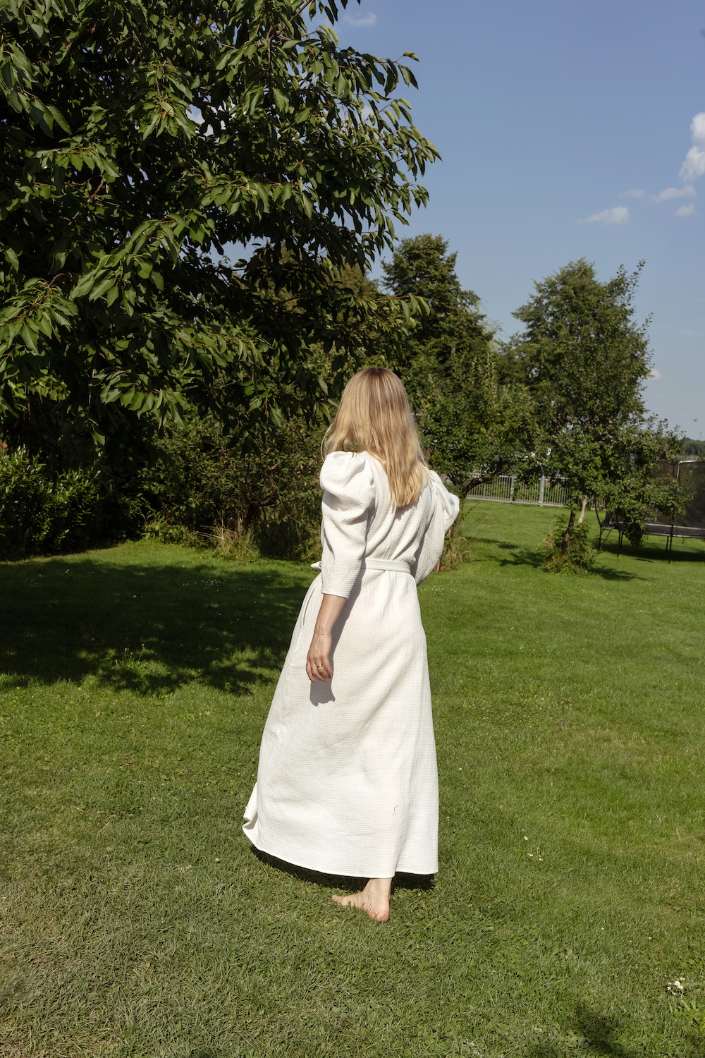 Getragen werden kann der Mantel nach der Dusche oder dem Bad, während der morgendlichen Kaffee-Routine, für die Korrespondenz im Homeoffice, auf dem Weg zum Pool oder Strand, zwischen Saunagängen im Spa oder für das Grandezza-Feeling abends auf der Couch. In die Stadt und zum Essen haben wir drei ATHALIE übrigens auch schon ausgeführt und selten wurde ich sooft auf ein Kleidungsstück angesprochen, wie auf diesen Mantel.