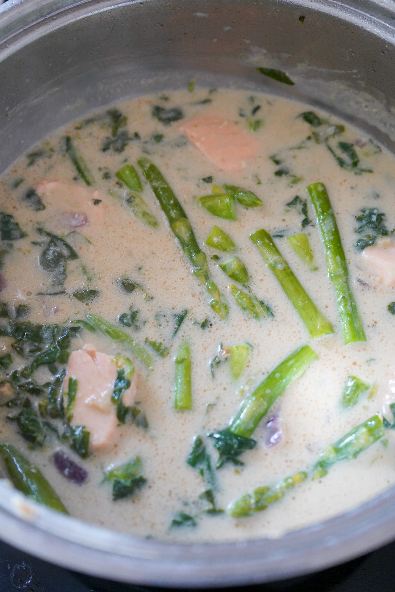 TK Lachs und Blattspinat morgens aus dem Froster holen. Mittags Reis oder Quinoa als Beilage kochen. Salz nicht vergessen! Frischen Spinat lesen. Spargel bissfest garen. Ingwer, Zwiebel und – wer mag – Knoblauch klein hacken und in Rapsöl sachte anbraten. Misopaste dazu geben. Kurz karamellisieren lassen. Mit etwas Wasser ablöschen. Kokosmilch hinzugeben, kurz aufkochen. Hitze reduzieren, sonst flockt die Kokosmilch. Spargel abgießen und abschrecken. Blattspinat ins Curry geben. Noch gefrorener TK-Blattspinat benötigt etwas länger, bis er zerfällt. Mit frischem Spinat könnt ihr gleich weitermachen.