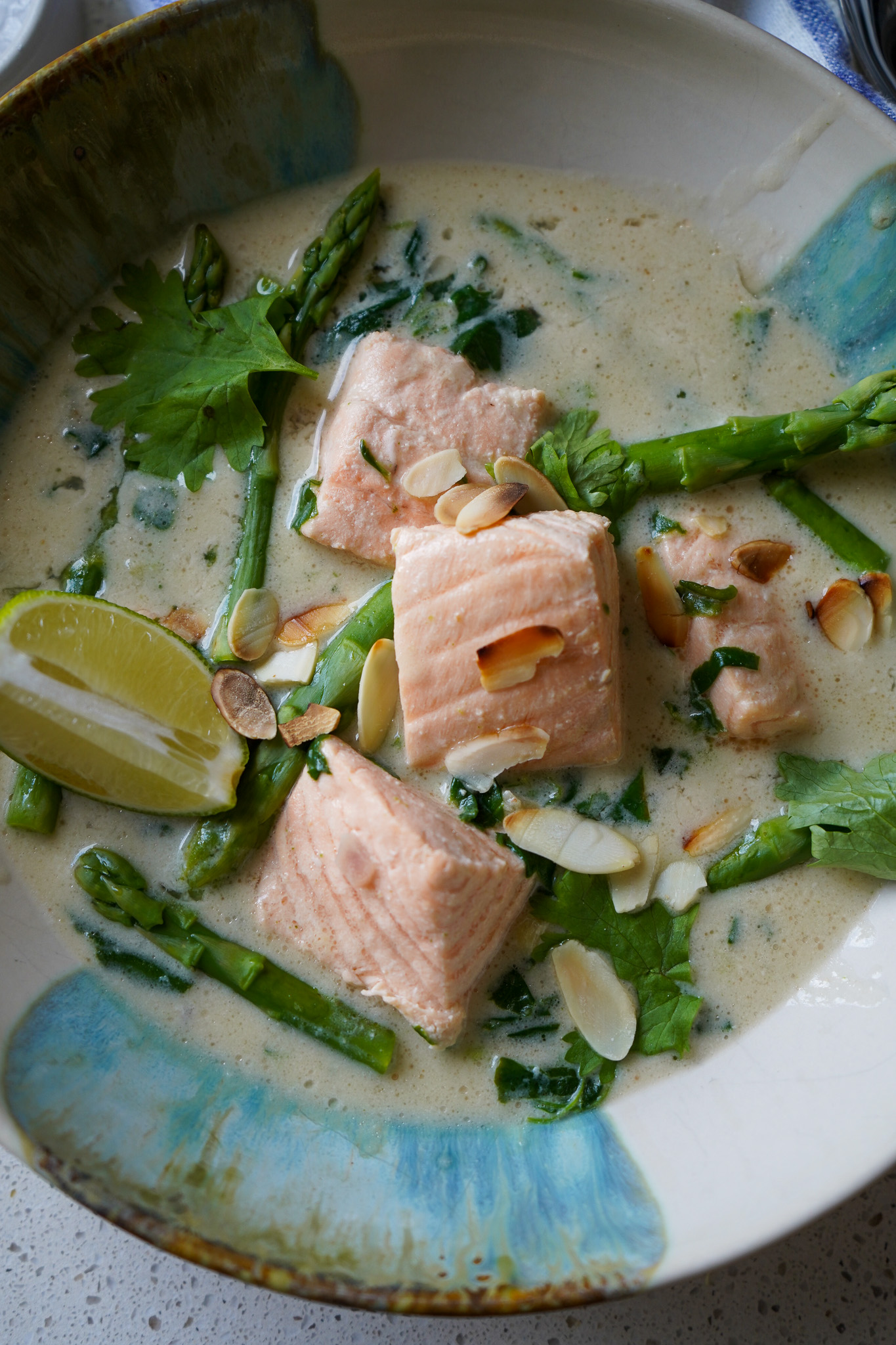 Lachs abtupfen und in nicht zu kleine Stücke schneiden. Ebenfalls in das Curry geben und 10 Minuten bei niedriger Hitze gar ziehen lassen. Mandelblätter in einer beschichteten Pfanne anrösten. Testen, ob der Lachs in der Mitte nur noch dunkelrosa ist – dann ist er gar. Spargel zum Curry hinzufügen.