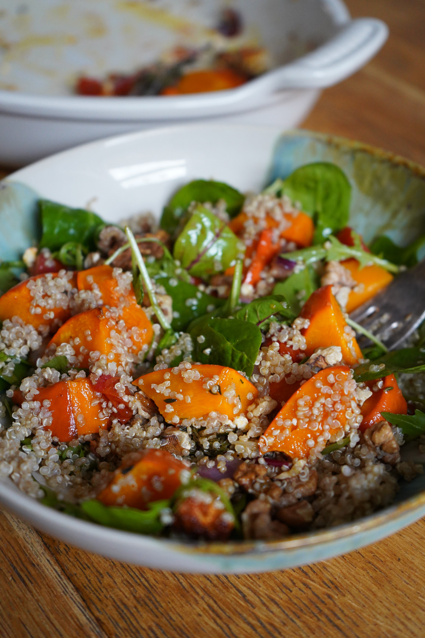 Für jeweils eine Person in einem Teller die gemischten Blattsalate ausbreiten. Mit 1 EL Essig, Prise Meersalz, Spritzer Kokos Aminos und 1 EL Olivenöl „anmachen“. Ofengemüse darüber geben. Das ist der 1. Salat! Wenn ihr mehr Hunger habt, dann könnt ihr das alles jetzt noch mit gekochtem Quinoa und Walnüssen tunen. So lecker geht’s in diesem Jahr weiter.
