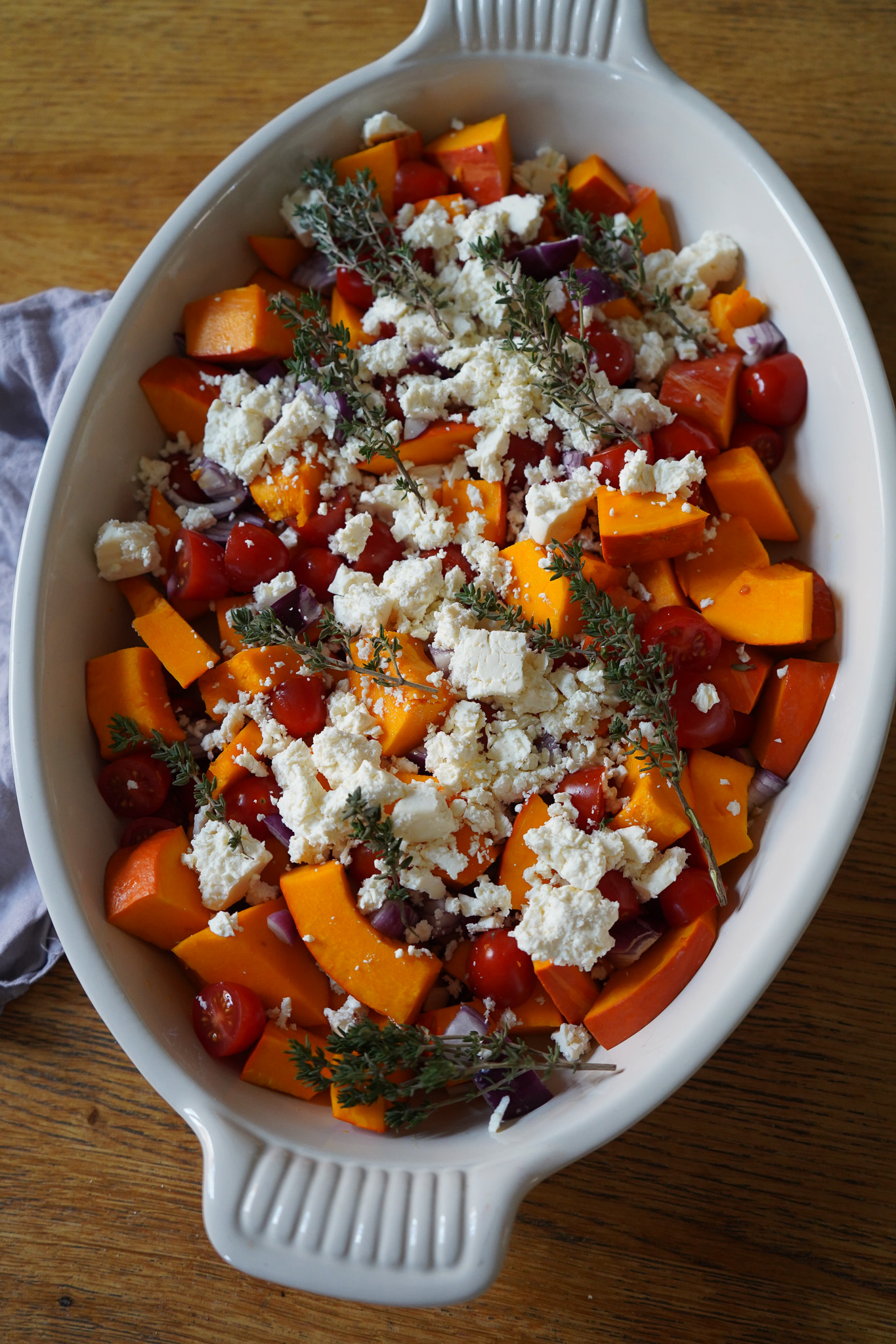 2 EL Olivenöl in eine Auflaufform (unsere ist die „Ovale Auflaufform Tradition aus Steinzeug“ von Le Creuset) geben. Kürbis, Tomaten und Zwiebel darin anrichten. Feta klein schneiden oder mit den Händen über das Gemüse krümeln. Salzen und pfeffern. Thymianzweige darüber legen. Abermals 1-2 EL Olivenöl darüber geben. Im Ofen für 10-20 Minuten backen. Der Käse sollte weich sein, der Kürbis bissfest.