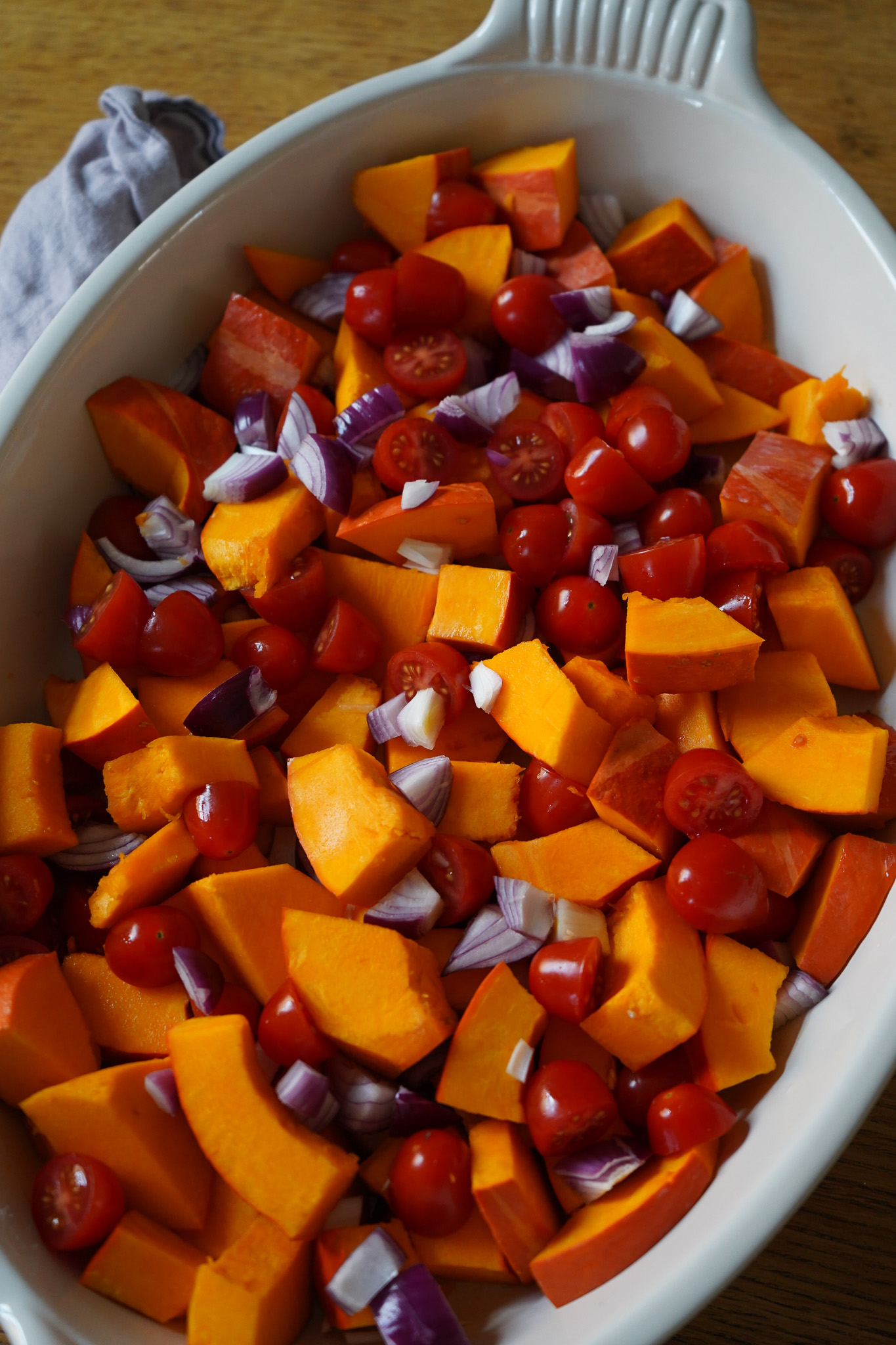 Kürbis waschen, halbieren, entkernen und in mundgerechte Stücke schneiden. Tomaten waschen und quer halbieren. Rote Zwiebel enthäuten, halbieren und in Streifen schneiden. Feta abtropfen lassen.