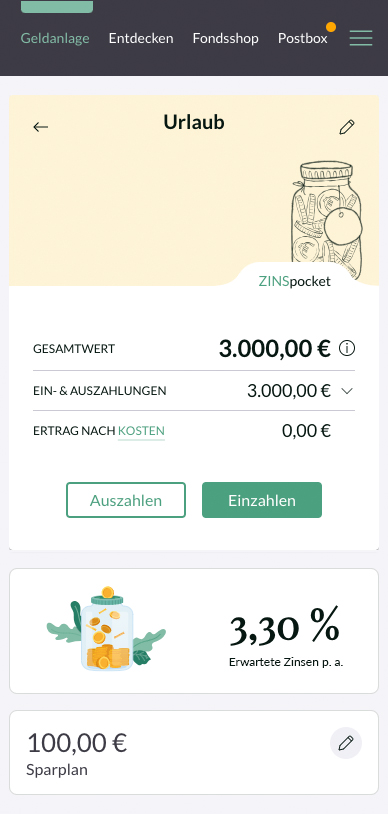Andere Banken locken mit mehr Zinsen, aber diese Angebote gelten meisten nur für Bestandskunden, sind an hohe Anlagesummen gebunden oder maximal für sechs Monate gültig – dann setzt die Bank die Zinsen wieder runter. Das Evergreen ZinsPocket bietet einen erwarteten Zinssatz von 3,30 % pro Jahr – ohne das Risiko einer Geldanlage, Laufzeitbegrenzung oder einer Mindest- oder Maximalhöhe der Anlagesumme. Zinsen ohne Wenn und Aber sozusagen.