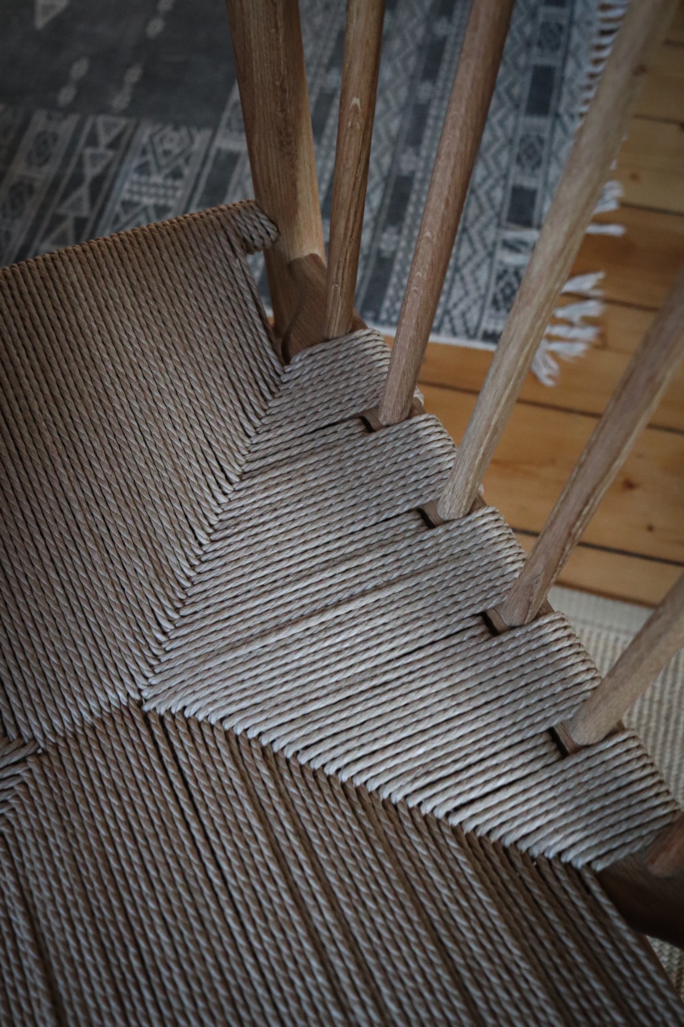 Und sind die Stühle auch bequem?, fragt ihr euch. Immerhin sitzt man auf Papierkordeln. Ja, das Detail fanden wir schon bei den Wishbone Chairs gut. Die Kordeln geben etwas nach, sind also nicht so hart wie Holz, aber auch nicht so anfällig wie für Abrieb oder Flecken wie Stoff oder Leder.