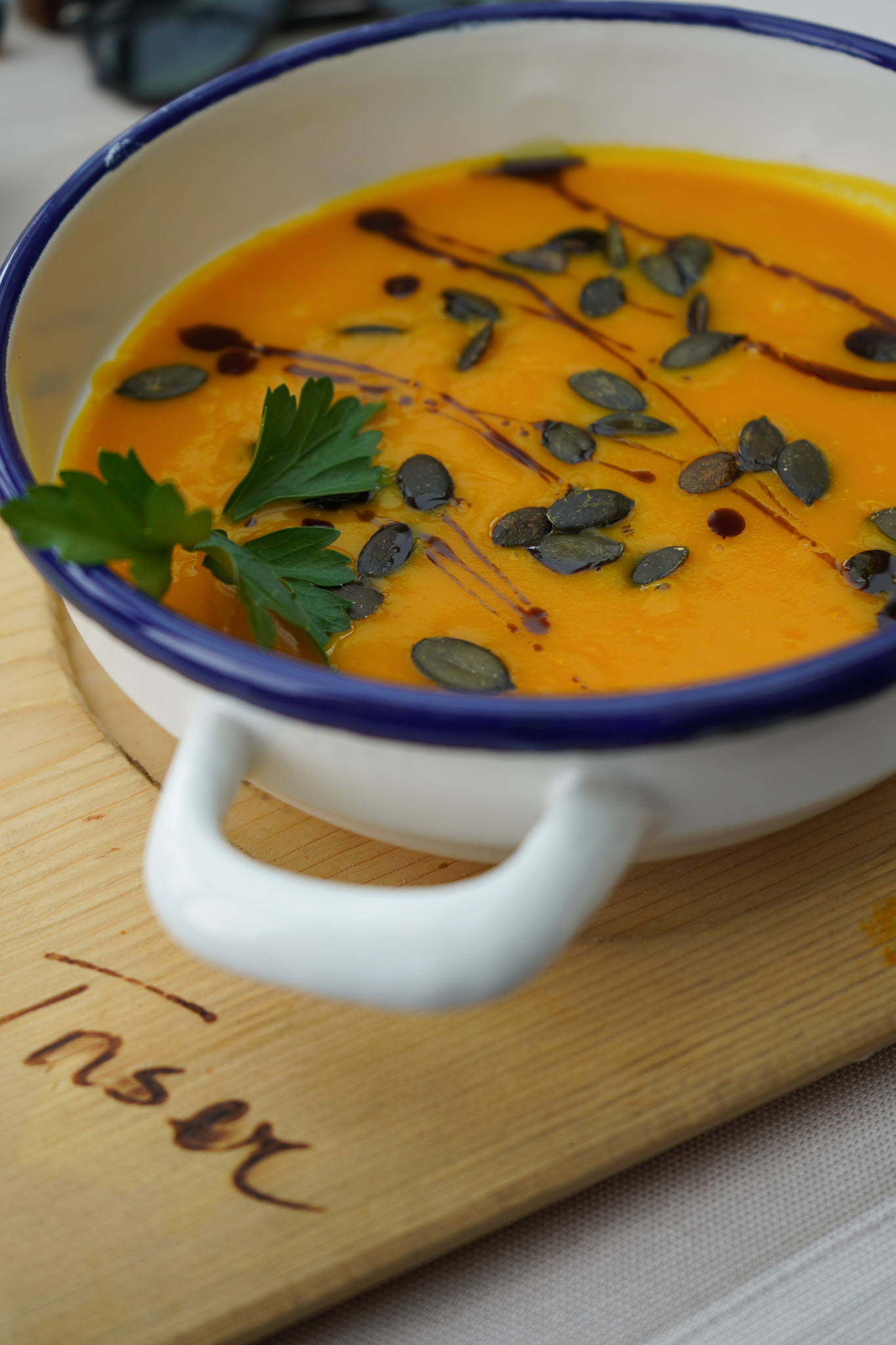 2. Kürbiscremesuppe mit Kürbiskernöl und Kernen auf der Taser Alm in Schenna