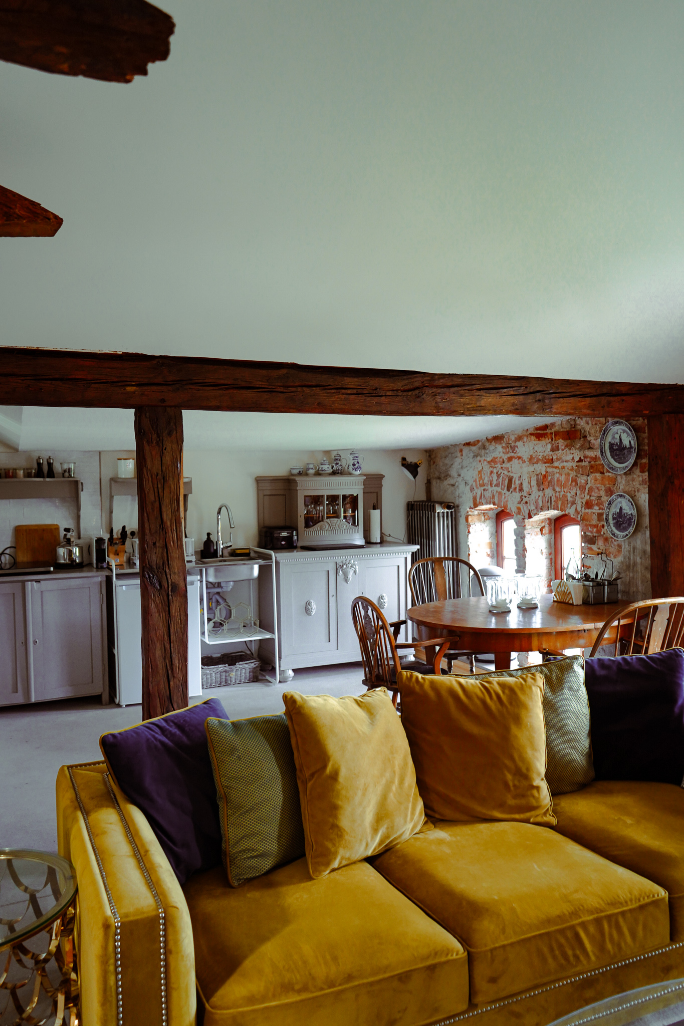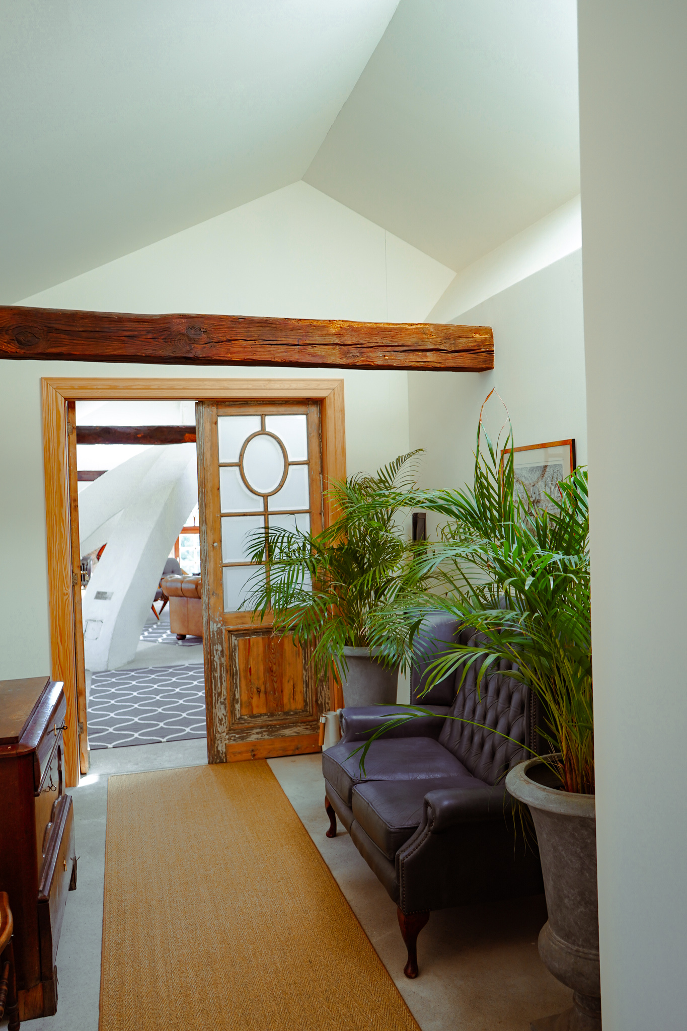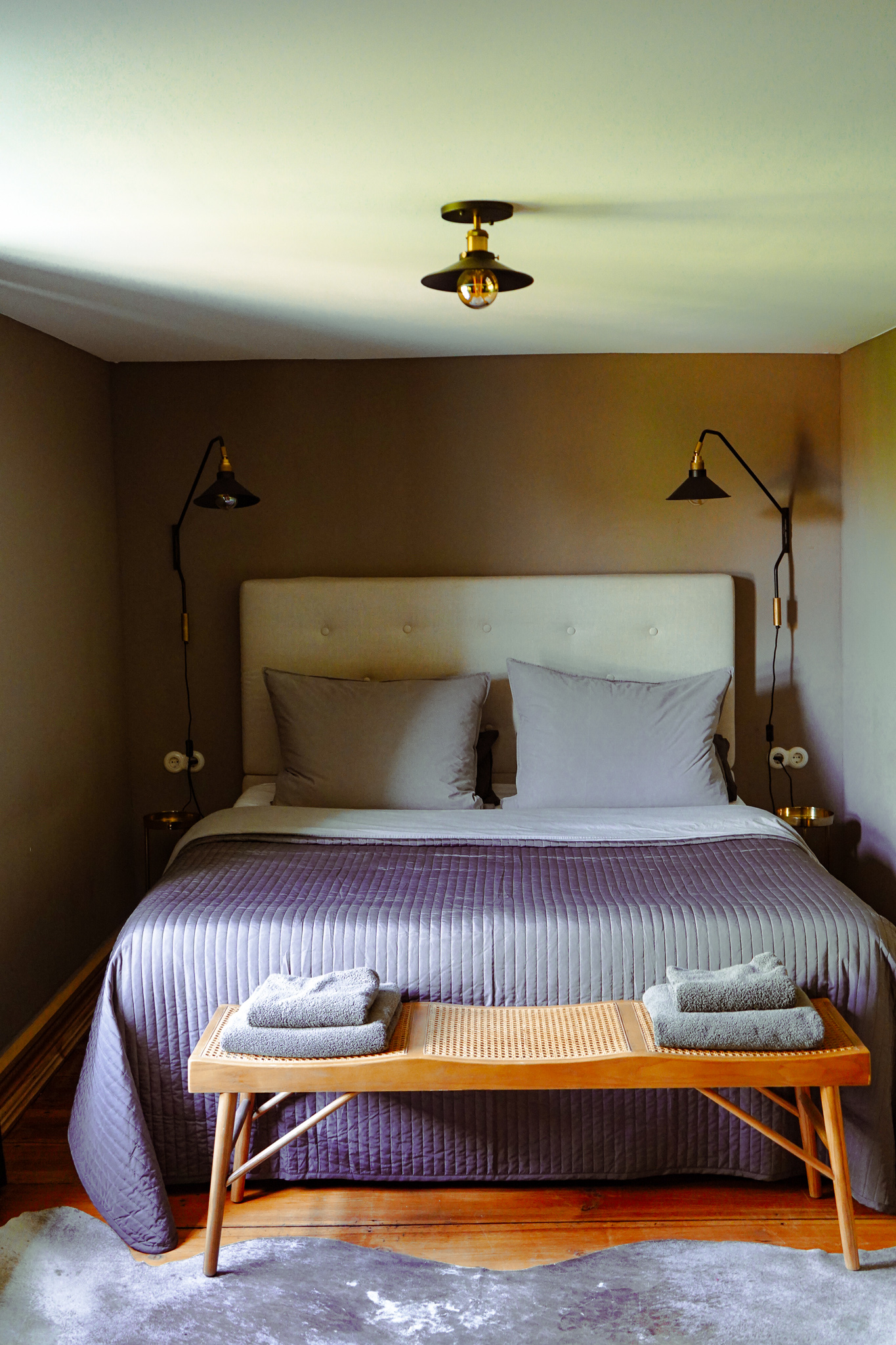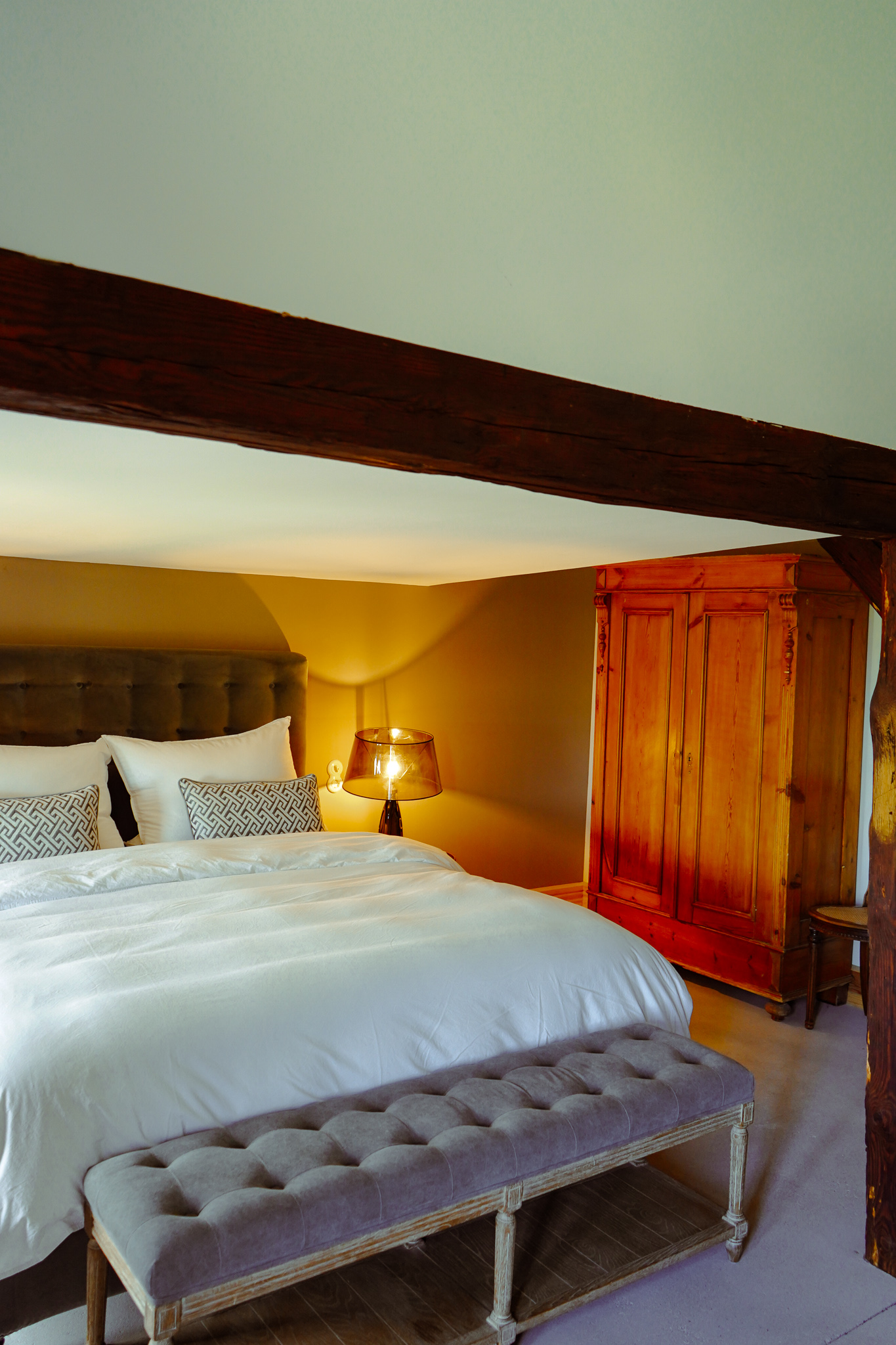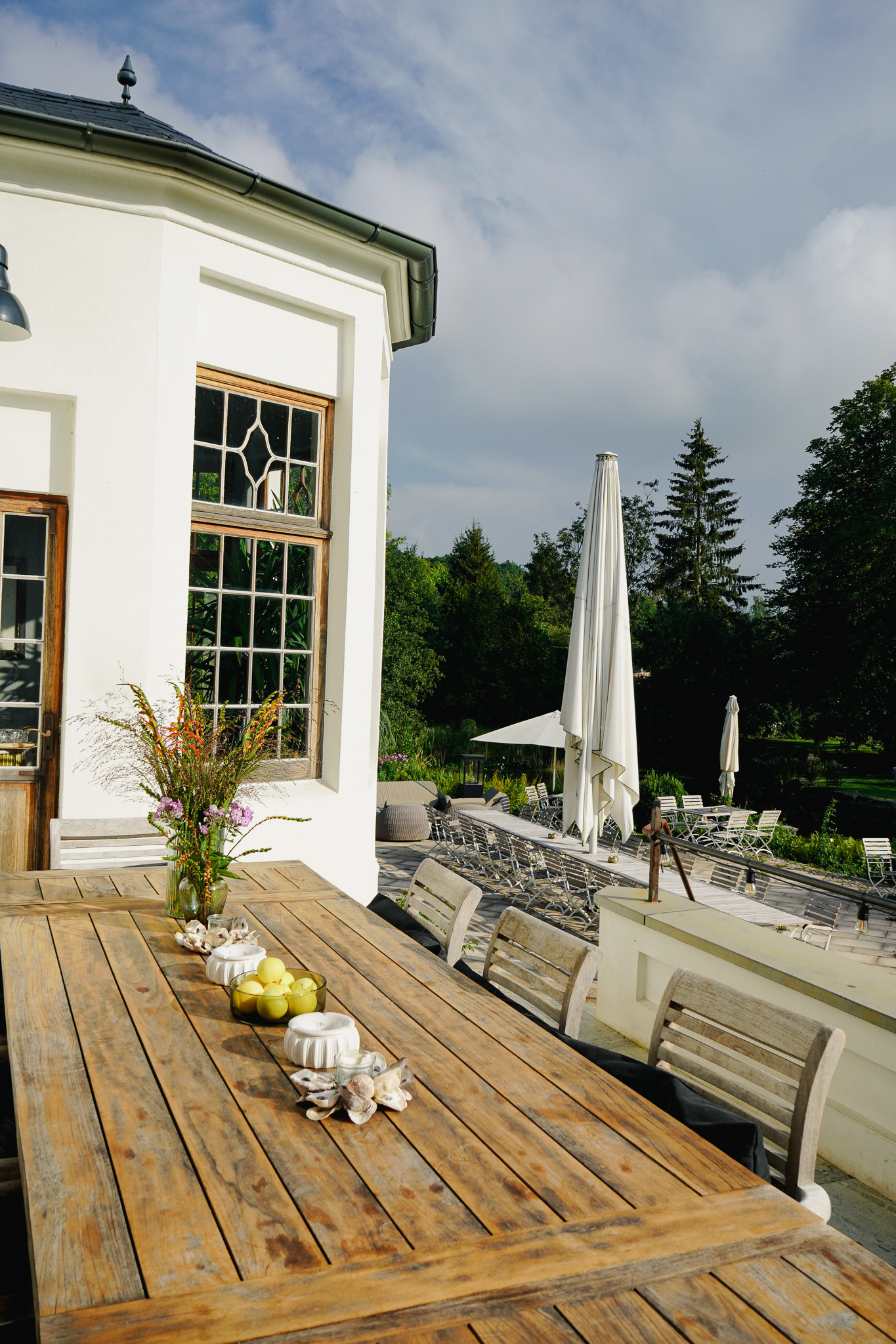 Gastfreundschaft liegt ihr im Blut. Sie kennt die Wünsche und Bedürfnisse ihrer Gäste, ist aber kleine klassische Hotelchefin, die mit dunkelblauem Blazer am Eingang steht und fragt, ob man einen schönen Tag hat. Eher trifft man sie früh morgens im Garten in Leggings und Sneaker, wenn sie mit den beiden Hunden Ingwer und Atesh von einem Spaziergang über die angrenzenden Felder kommt. Sie dekoriert drinnen und draußen frische Blumen, zündet abends überall Kerzen an und drückt uns vor der Treppe schnell noch eine 6er-Packung Eier für das Frühstück in die Hand – die stammen natürlich aus dem Betrieb von Karl und sind bio.