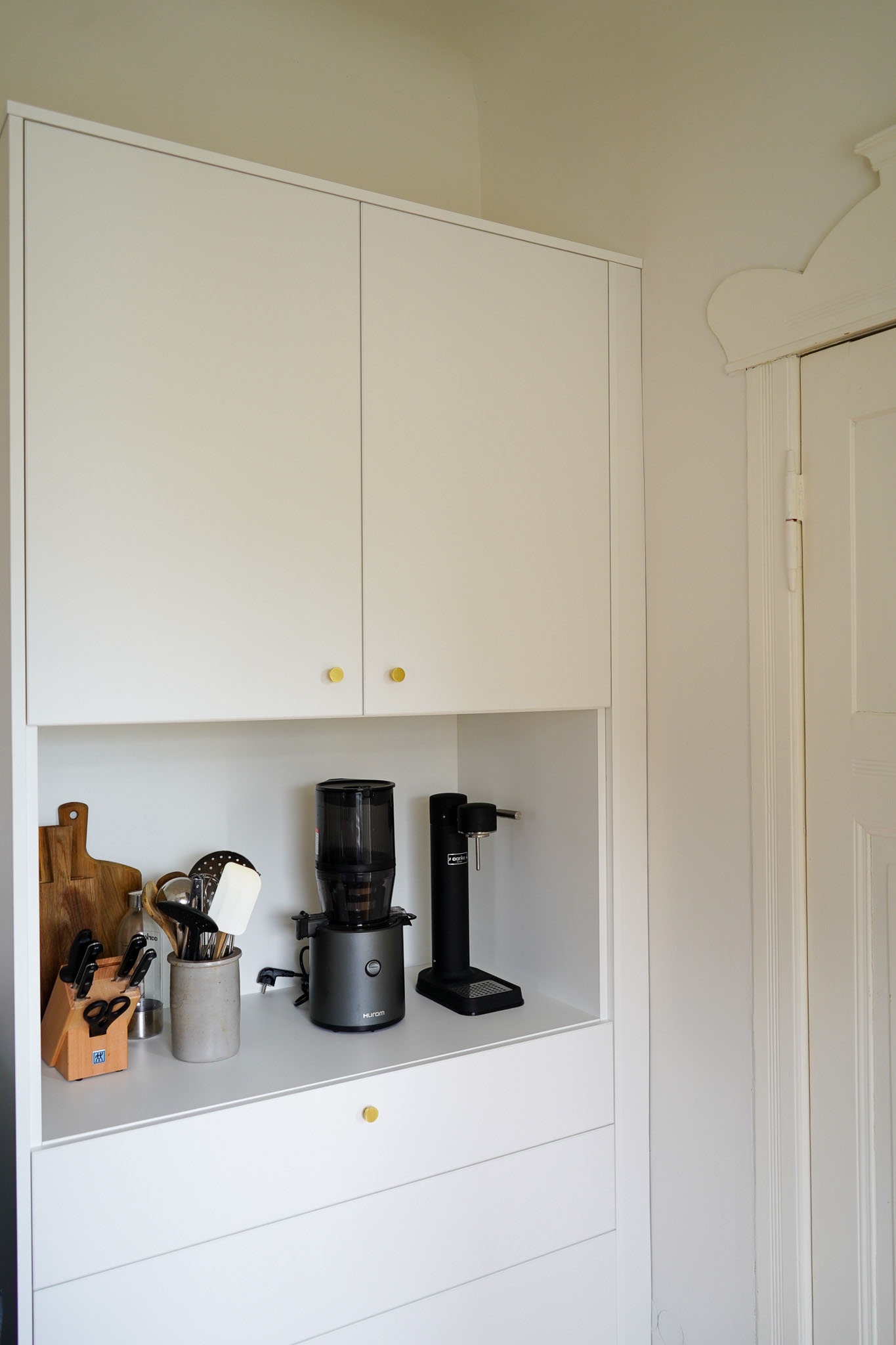 Die Veddinge-Küchenfronten von Ikea waren nach acht Jahren hinüber, hauptsächlich die Spülmaschinenfront aufgrund des Wasserdampfes. Wir haben lange überlegt, durch welche Fronten wir sie ersetzen: Superfront, Reform oder Plum Living? Es gibt zahllose Anbieter, die Ikea-Küchensysteme (wir haben Metod) aufhübschen, aber ich kam ich mit keiner zu Recht und fand die Preise für ein paar Holzbretter absurd. Außerdem hatte ich keine Lust auf einen komplizierten Aufbau und deshalb den Auftrag wieder in die Hände der Brandenburger Lebenshilfe gegeben, die auch alle unsere Heizkörperverkleidungen und Kleiderschränke in den Schlafzimmern maßangefertigt haben. Die Ziele der Lebenshilfe sind Gleichberechtigung und Barrierefreiheit für Menschen mit geistiger Behinderung. Ich bin so happy über die Zusammenarbeit, denn die Jungs arbeiten 100 % perfekt.