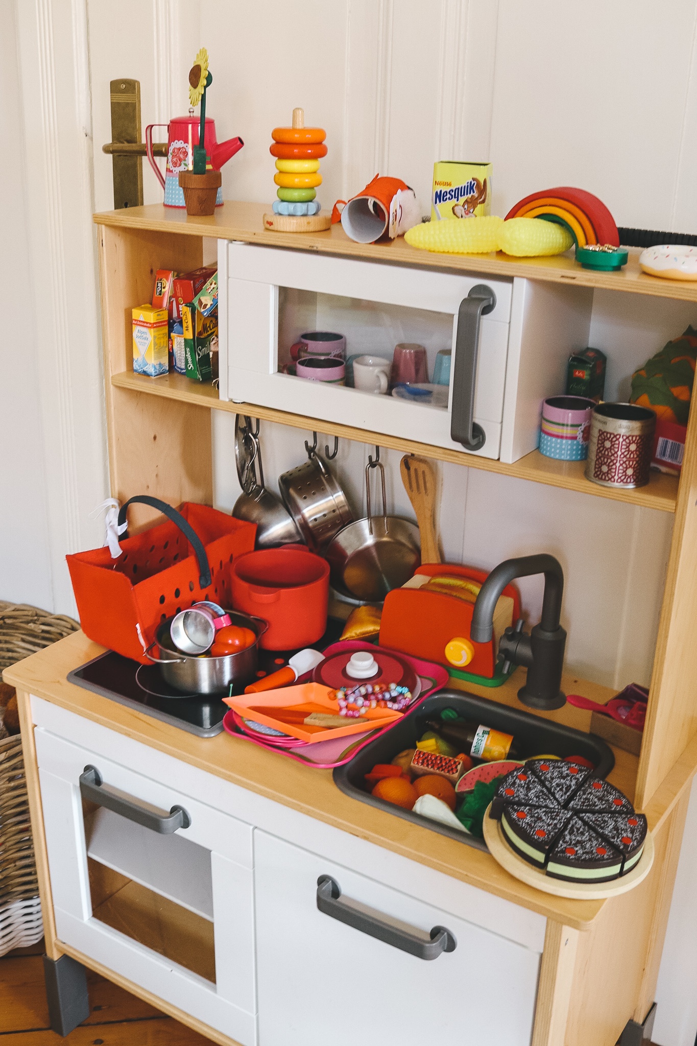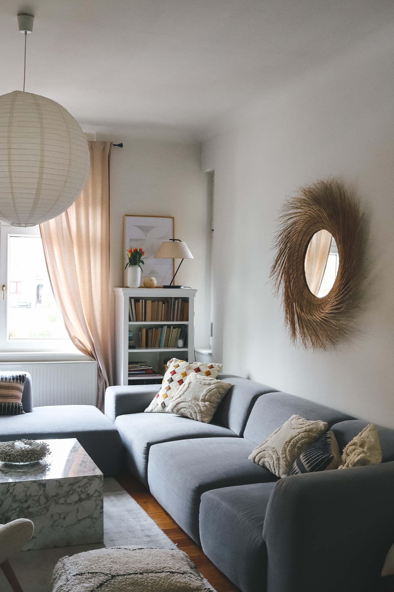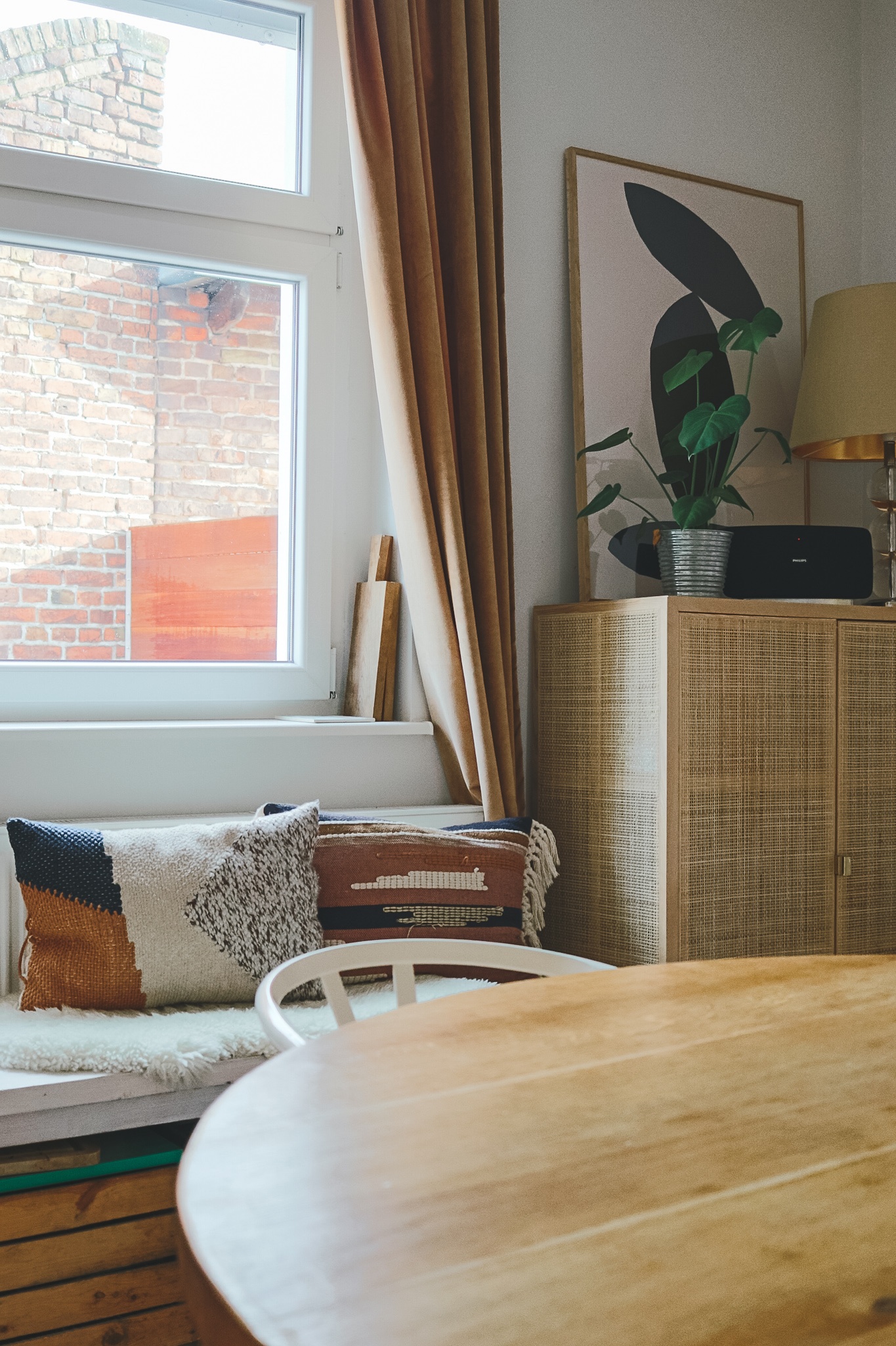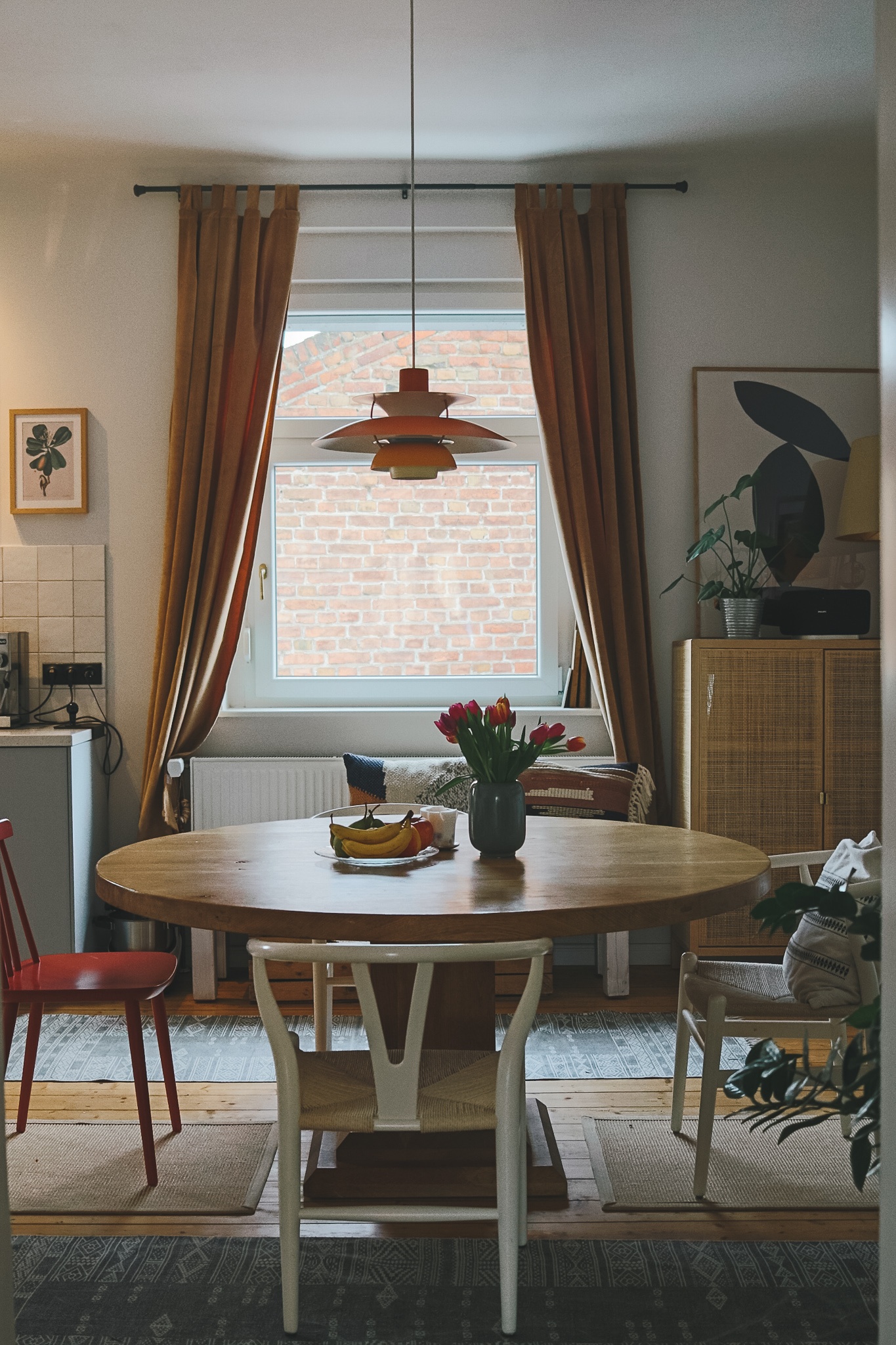*Affiliate LinksLampe im Esszimmer: Louis Poulsen PH5, rosa Regal: Johanenlies, Esstisch: Maßanfertigung aus Eiche, Küche: Metod/Veddinge von Ikea, Griffe: Superfront, Stühle: Wishbone Chair (Vintage), roter Stuhl: Mycs, Rattankommode: Ikea (so ähnlich hier), Sofa: Mycs, runder Spiegel: Maisons du Monde, Poster: PLYTP