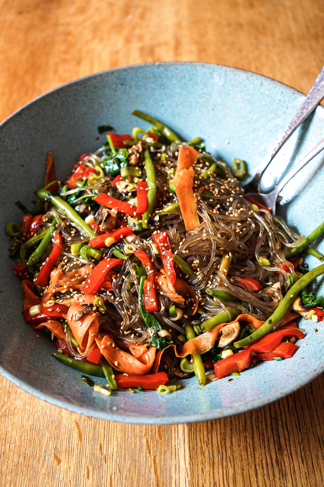 Der Hack: Die Gemüsesorten werden einzeln angebraten. So behalten Paprika & Co. nicht nur ihre bunte Farbe, sondern ihren individuellen Geschmack. Das Ergebnis: ein kleines Aroma-Spektakel! Ansonsten wäre es es gebratenes Gemüse mit Glasnudeln. Fleisch brauche ich dazu persönlich gar nicht mehr, deshalb habe ich es weggelassen. Wenn Fleisch euer Gemüse ist, empfehle ich euch Minutensteaks oder Filet. Was ich mit oder ohne Fleisch an diesem Rezept genial finde: Japchae schmeckt lauwarm, aber auch kalt am nächsten Tag.