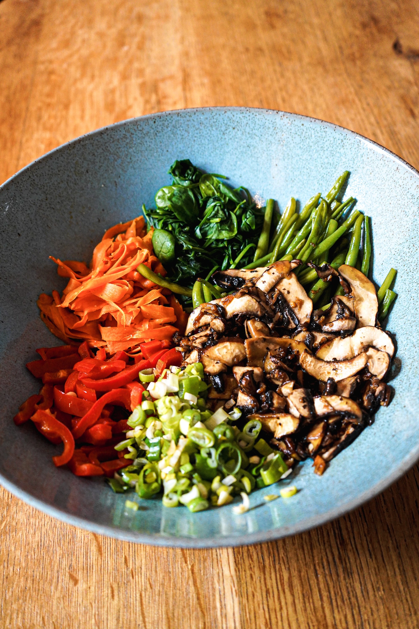 Möhren schälen und mit dem Sparschäler in dünne Streifen ziehen. Buschbohnen blanchieren also in Salzwasser bissfest garen, kalt abspülen. Pilze putzen und in feine Streifen schneiden. Knoblauch pellen, den Keim entfernen und in eine Schale pressen. Mit Sojasoße, Agavensirup und Sesamöl mischen und die Pilze in der Hälfte der Marinade marinieren. Den Rest der Soße beiseite stellen.