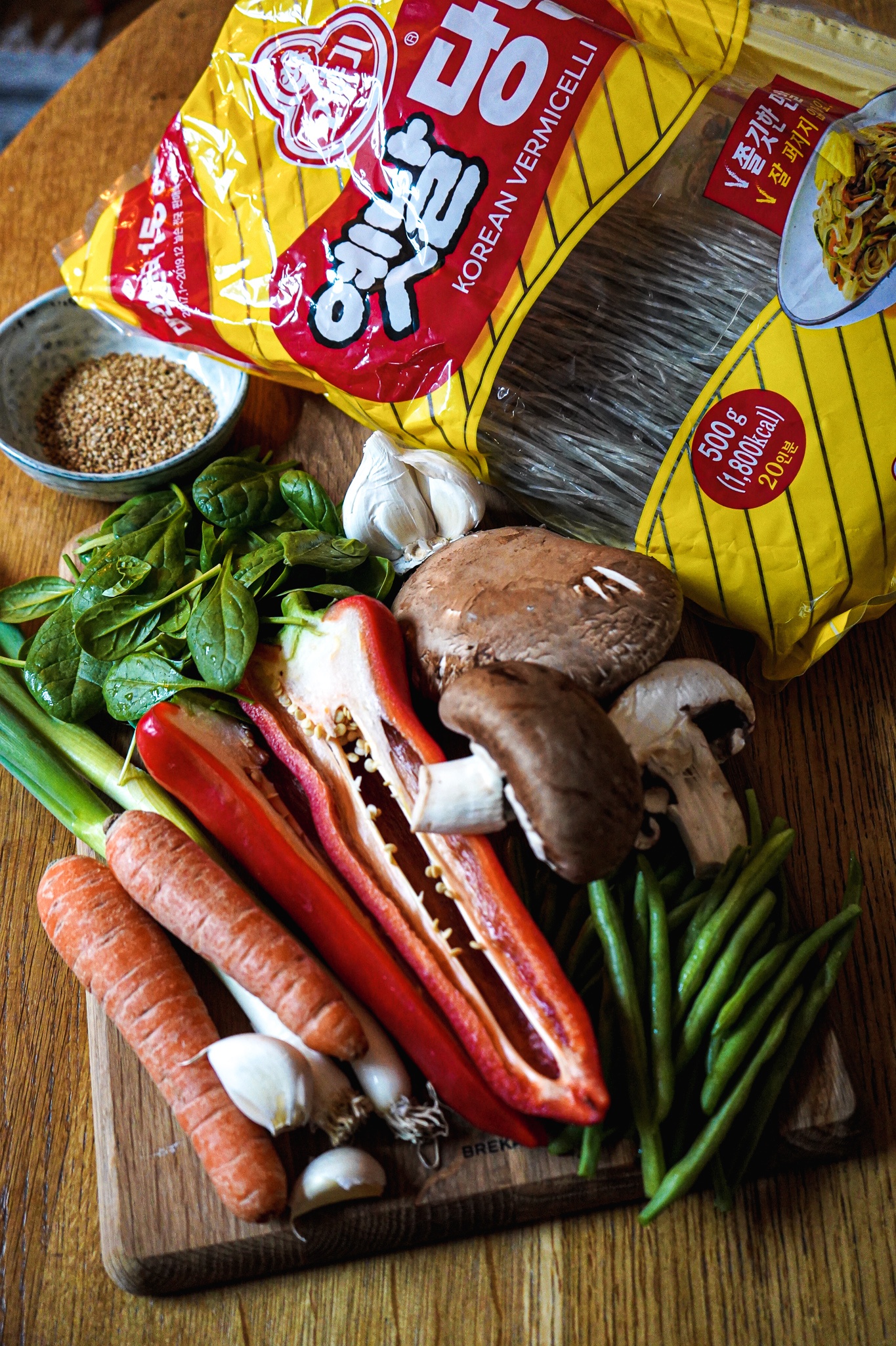 Dieses Rezept ist für mich ein Stück Kindheit, denn eine enge Freundin meiner Mutter war Koreanerin und hat uns Kindern gelegentlich Japchae gekocht. Wir haben uns um jede Nudel gekloppt, so lecker war das. Ihr Name war Ok-hi (ausgesprochen „Okie“) und ich erinnere mich noch heute an ihr mitreißendes Lachen. Ich maße mir keinesfalls an, das Original-Rezept nachkochen zu können, aber meines Wissens besteht Japchae aus Süßkartoffelnudeln, angebratenen Gemüsesorten und wahlweise Rindfleischstreifen. Gewürzt wird mit Sojasoße, Sesamöl und Knoblauch. Viiiel Knoblauch, deswegen sollte er unbedingt frisch sein.