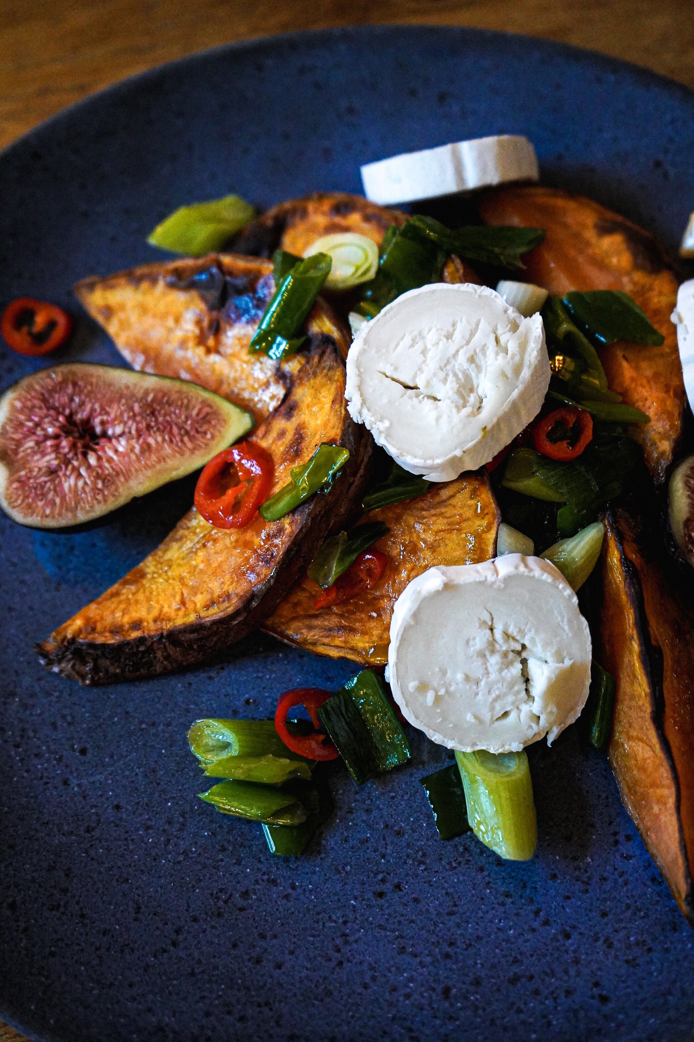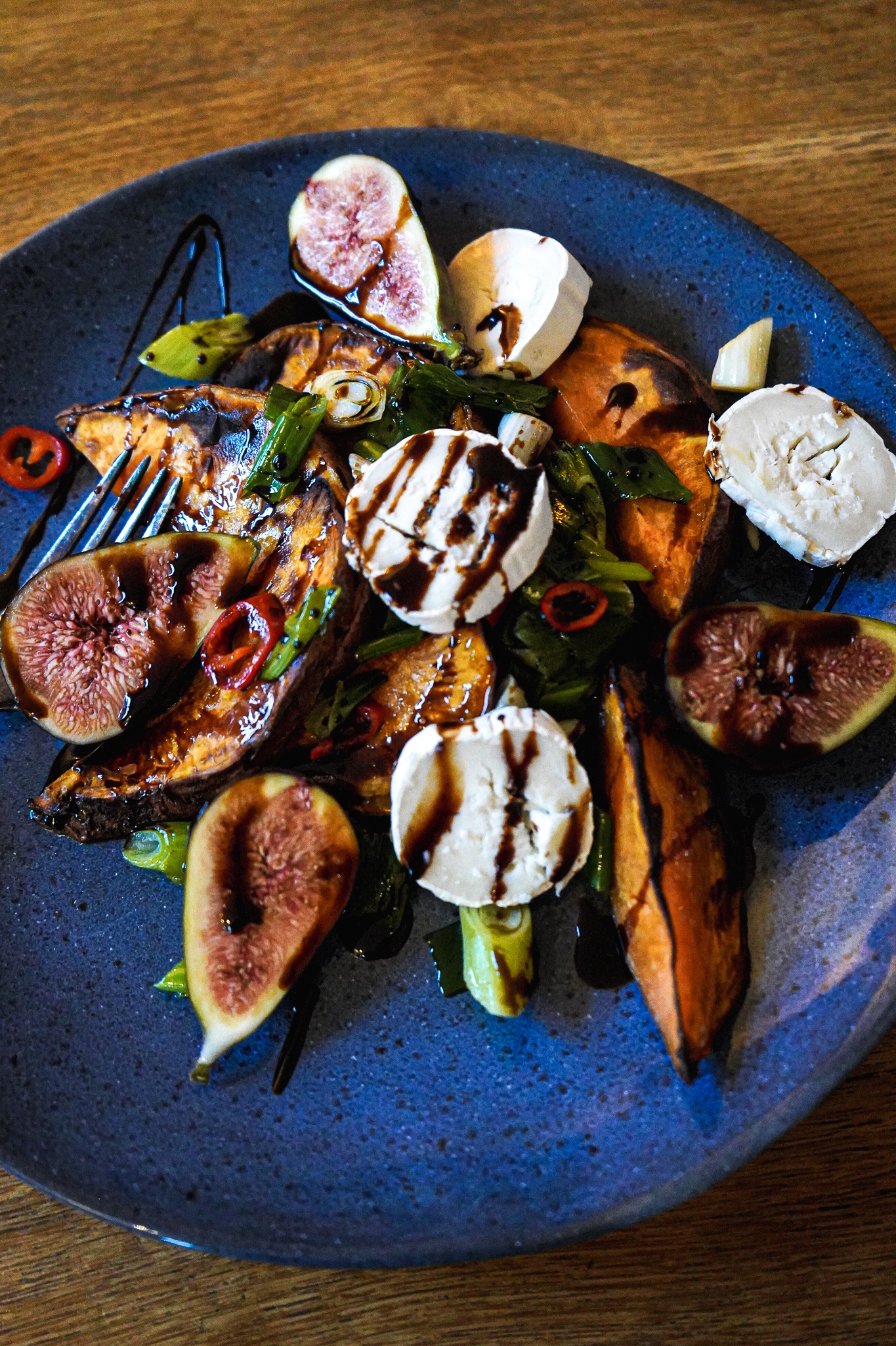 Die Ziegenkäserolle in Taler schneiden. Wenn die Süßkartoffeln fertig sind, die Spalten auf einen hübschen Teller legen. Feigen dazwischen dekorieren. Frühlingszwiebeln und entkernte Chilischote mit einem Löffel über die Kartoffeln geben. Ziegenkäsetaler auf dem Salat drapieren. Zum Schluss die Balsamico-Reduktion über alle Zutaten träufeln. Ich habe das etwas altmodisch in einem Zickzackmuster gemacht, vielleicht fällt euch ein besserer Move ein?