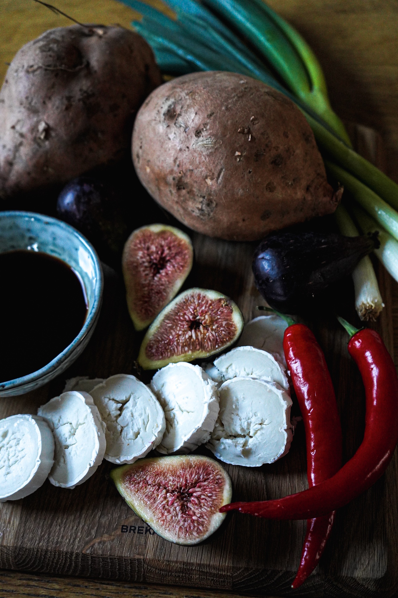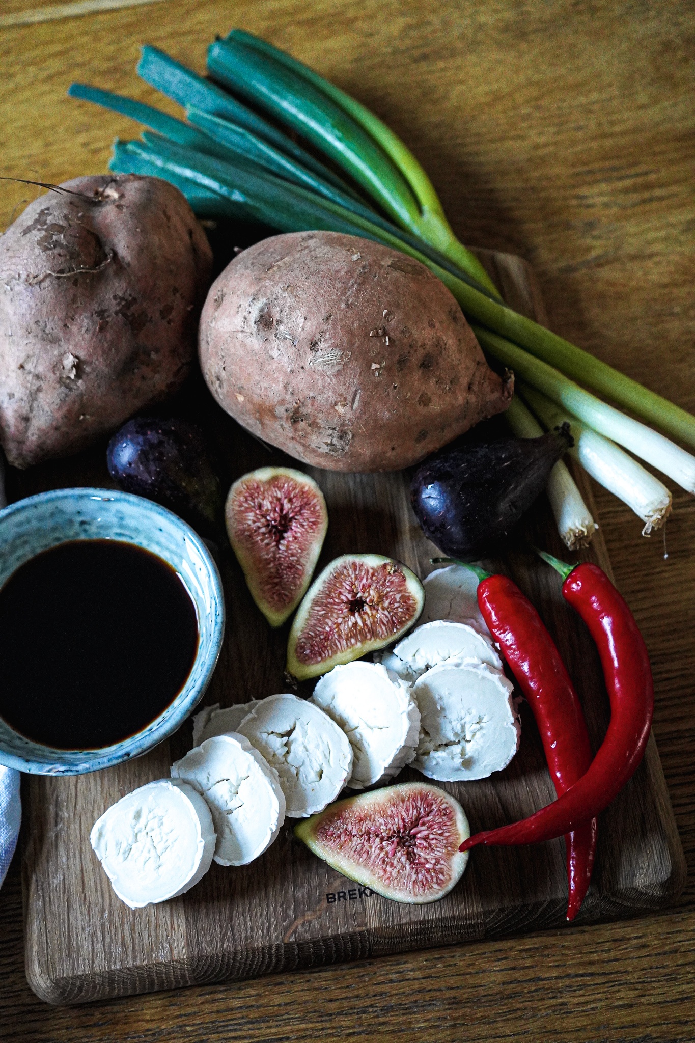 Süßkartoffel waschen. Mit einem großen Messer halbieren, vierteln und achteln. Die Kartoffelstücke in einer Schüssel mit 5 EL Olivenöl, Meersalzflocken und etwas Pfeffer mischen. Backpapier auf einem Backblech ausbreiten. Die Kartoffelecken darauf verteilen und bei 220 Grad (Umluft oder Oberhitze) ca. 15-20 Minuten backen. Die Süßkartoffeln sollten bissfest und leicht gebräunt sein, aber nicht zerfallen. In der Zeit, in der die Kartoffeln im Ofen brutzeln, die Feigen und Frühlingszwiebeln waschen und gut abtropfen lassen. Ziegenkäserolle aus dem Kühlschrank holen, damit sie Raumtemperatur bekommt. Die Feigen halbieren und kurz beiseite stellen.