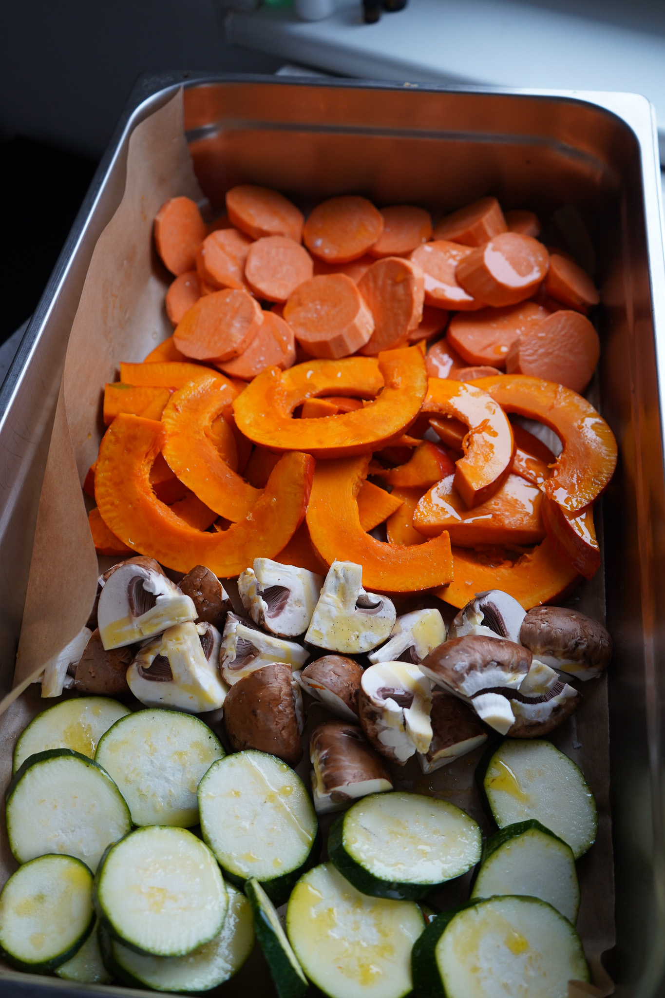 Ich schnippel jede Art von Gemüse, das ich im Kühlschrank finden kann, klein und mariniere es rundherum mit Meersalz, Pfeffer, Knoblauch, Thymian oder Rosmarin und reichlich Rapsöl.