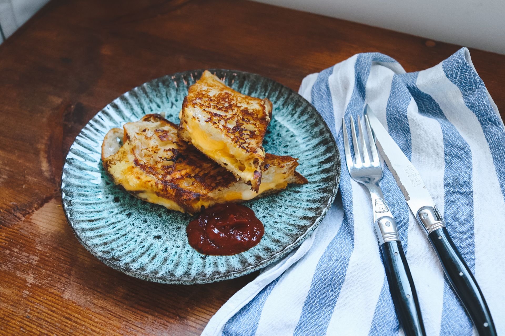 Sandwiches aus der Pfanne nehmen und in zwei Hälften schneiden. Mit Country Ketchup, Chili-Mayo oder einfach pur genießen. Schmeckt auch nach ein paar Stunden später kalt super.