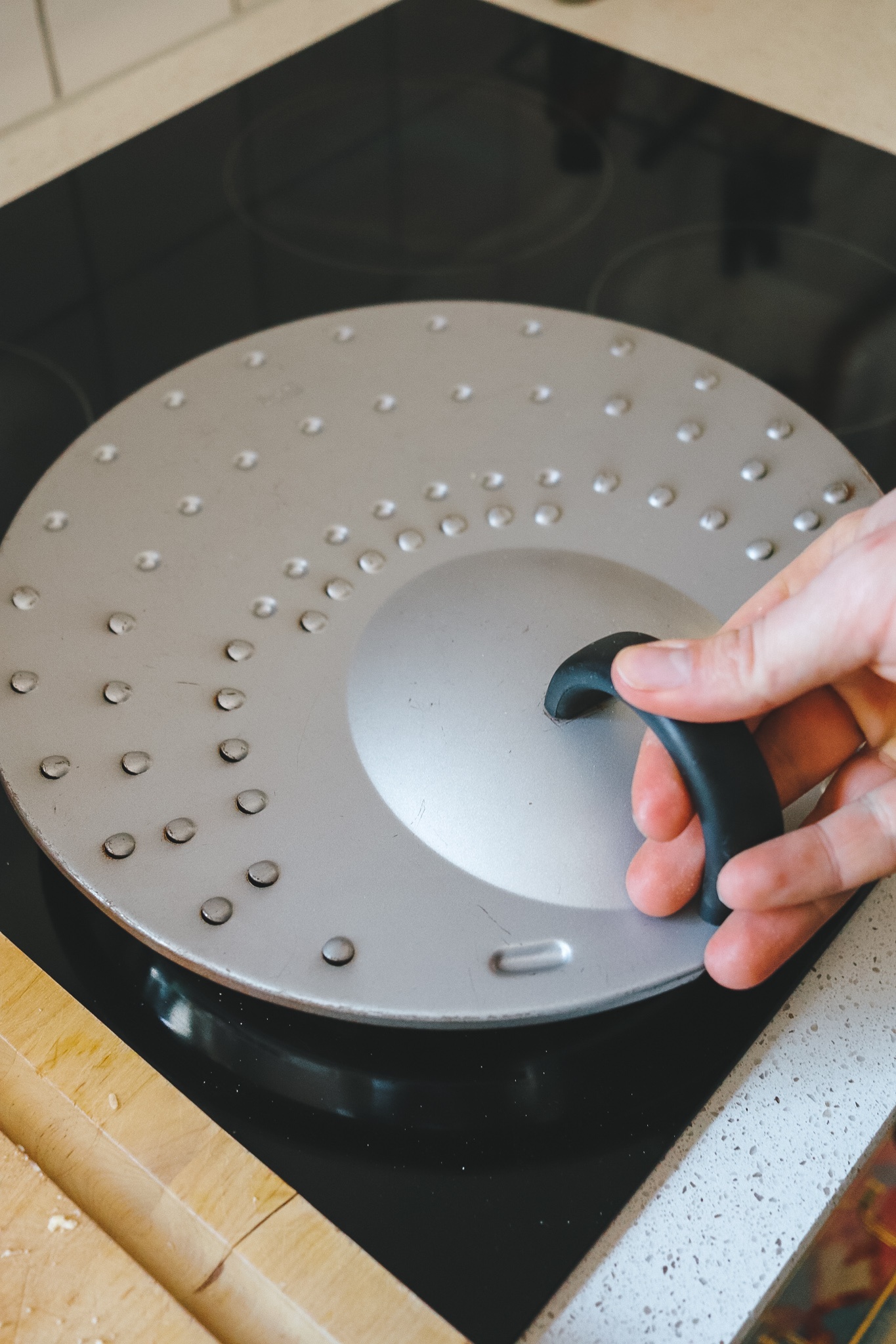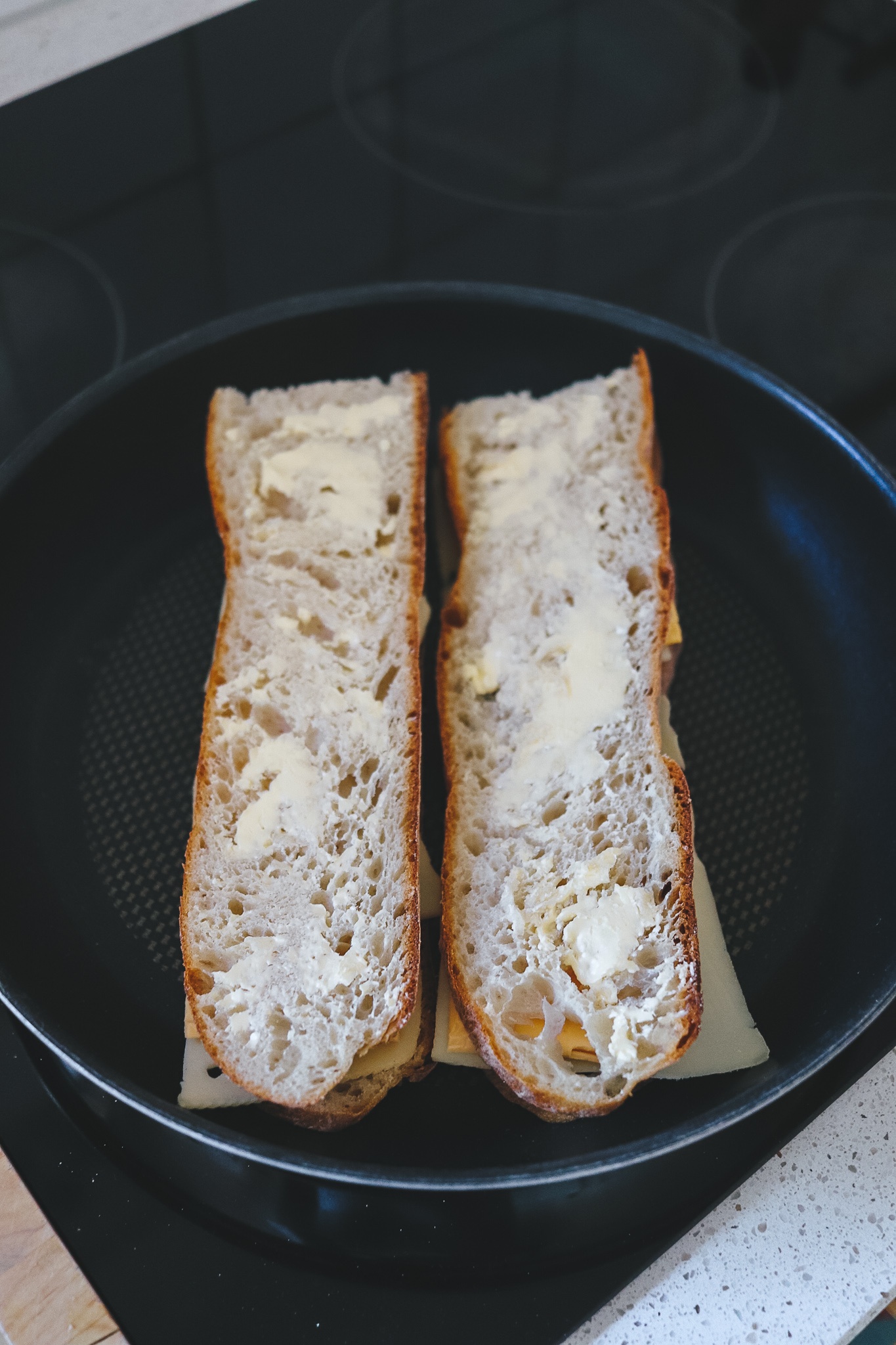 Eine beschichtete Pfanne erhitzen (wir stellen bei maximal 9 Stufen auf 7) und die Brote nebenbeinander in die Pfanne legen. Deckel drauf. 3 Minuten warten und gucken, ob sich die untere Brotseite bereits bräunt. Dann wenden und auch die andere Seite knusprig braten.
