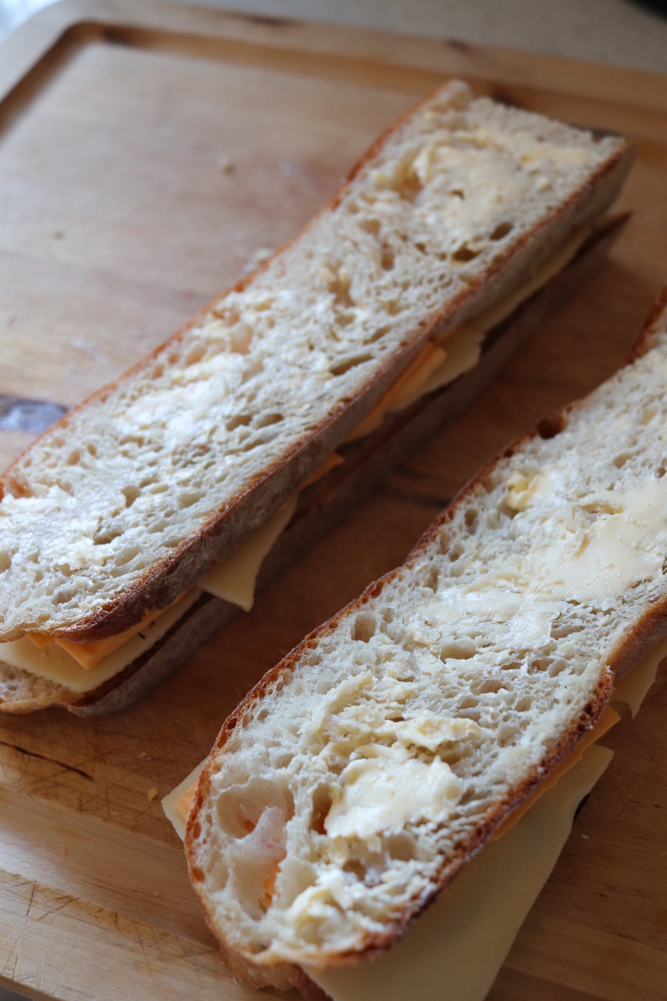 Baguette mit einem Brotmesser längst – nicht wie üblich quer – in möglichst grade, nicht zu dicke Scheiben schneiden. Das ist der erste Hack. Es ist wichtig, dass die Scheiben nicht wellig geschnitten sind, weil sie sonst später in der Pfanne nicht gleichmäßig bräunen können. Wenn ihr einen Sandwich-Maker habt, dann könnt ihr die Brote darin natürlich zusammenquetschen, aber in der Pfanne gebraten sieht ein Grilled Cheese Sandwich um ein vielfaches geiler aus und schmeckt fluffiger!