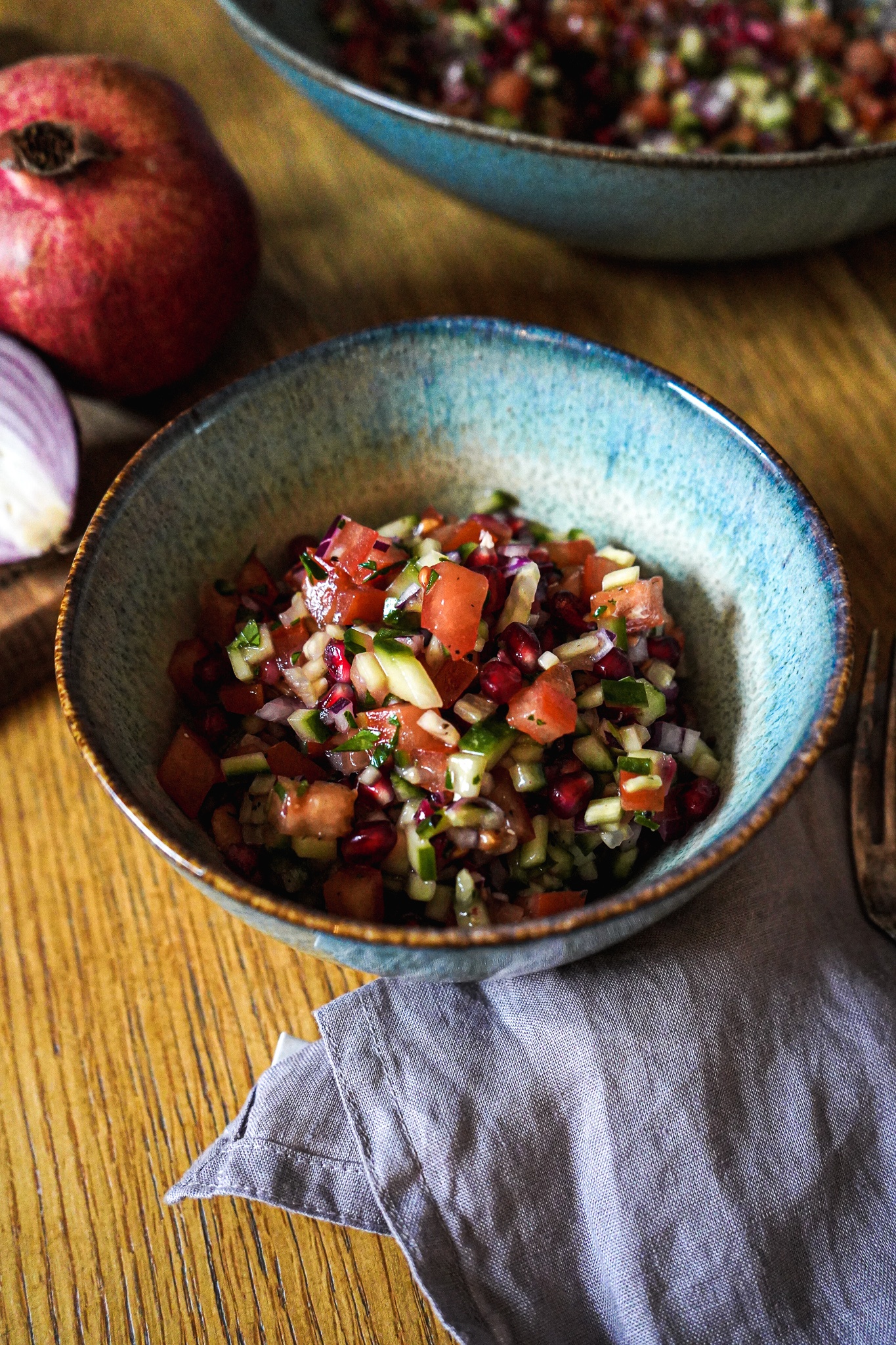 Dieser Salat ist auch als „Jerusalem Salat“ bekannt. Er sieht nicht nur bunt und hübsch aus, sondern ist sowohl familien- als auch partyfreundlich. Das bedeutet sogar Kinder mögen diesen Salat, zumindest meine Tochter, die auch gerne bei der Zubereitung hilft. Ich habe ihn mit Hummus und Pitabrot früher gerne bei einem Imbiss namens Sababa auf der Kastanienallee in Berlin bestellt. Er ist wirklich einfach nachzumachen und eignet sich mit entsprechenden Toppings als Hauptmahlzeit oder Beilagensalat zu Fisch, Fleisch, Kartoffelgratin, Pasta, Omelette, …