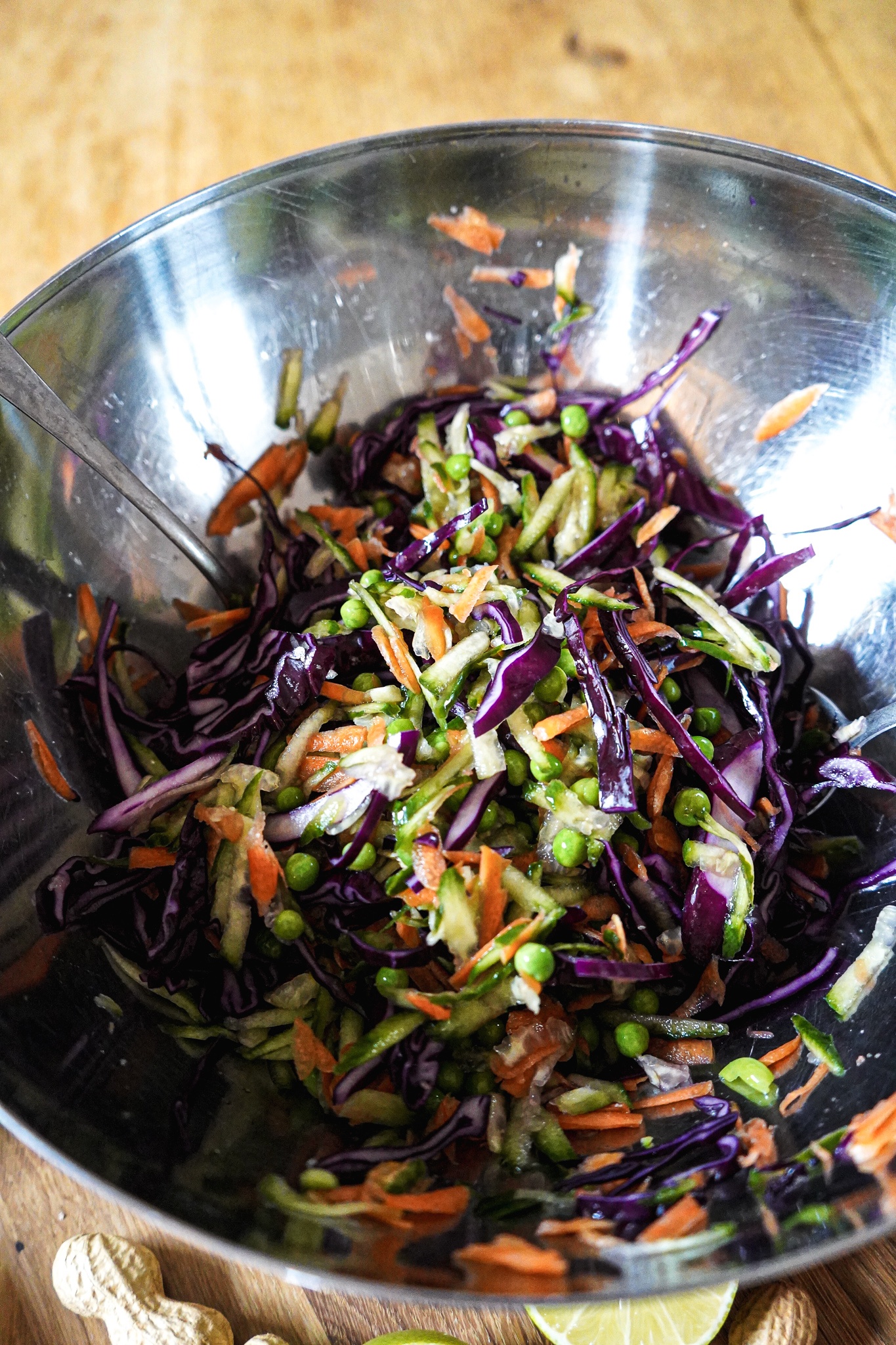 Quinoa-Salat mit Rotkohl, Möhren, Erbsen und Erdnuss-Limette Dressing