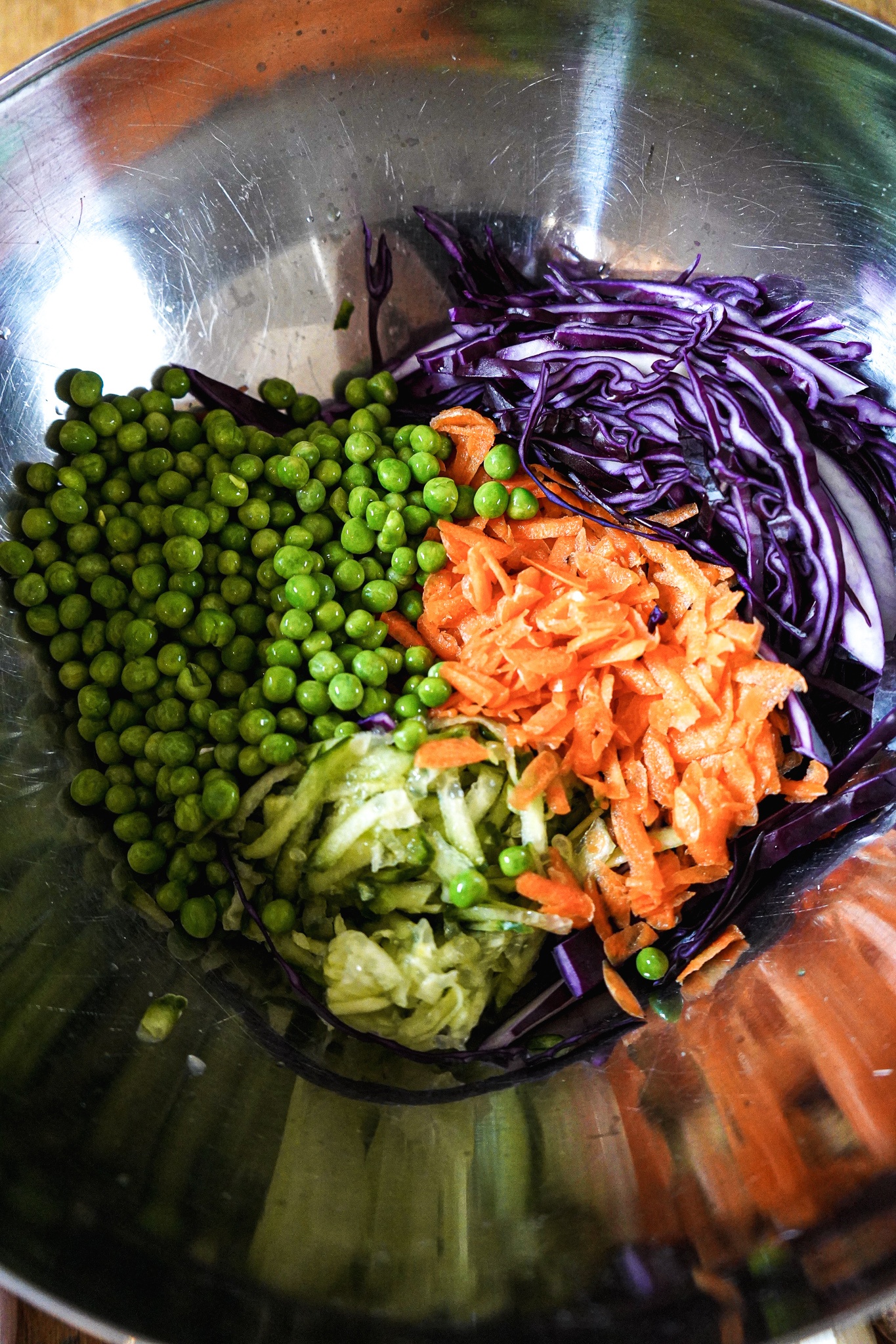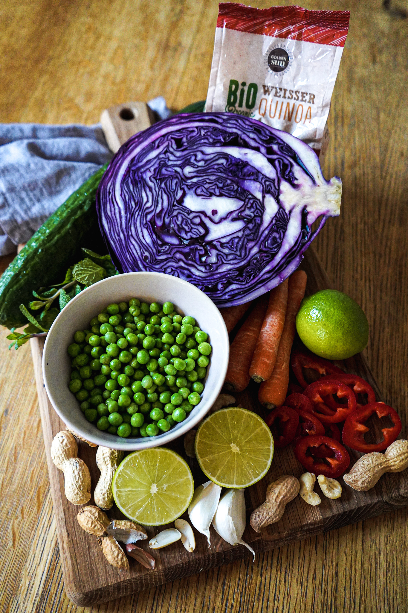 Weiter geht’s mit dem Gemüse: Rotkohl waschen, vierteln und in dünne Streifen („Julienne“) schneiden. Möhre und Gurke waschen und schneiden oder reiben. TK-Erbsen in einer Schale mit kochendem Wasser übergießen. In einem Sieb über der Spüle abtropfen lassen. Paprika waschen und in Ringe oder feine Streifen schneiden, je nachdem wie groß sie ist. Rotkohl, Möhren, Gurken und Erbsen in einer großen Schüssel mischen. Den abgekühlten Quinoa sachte unterheben.