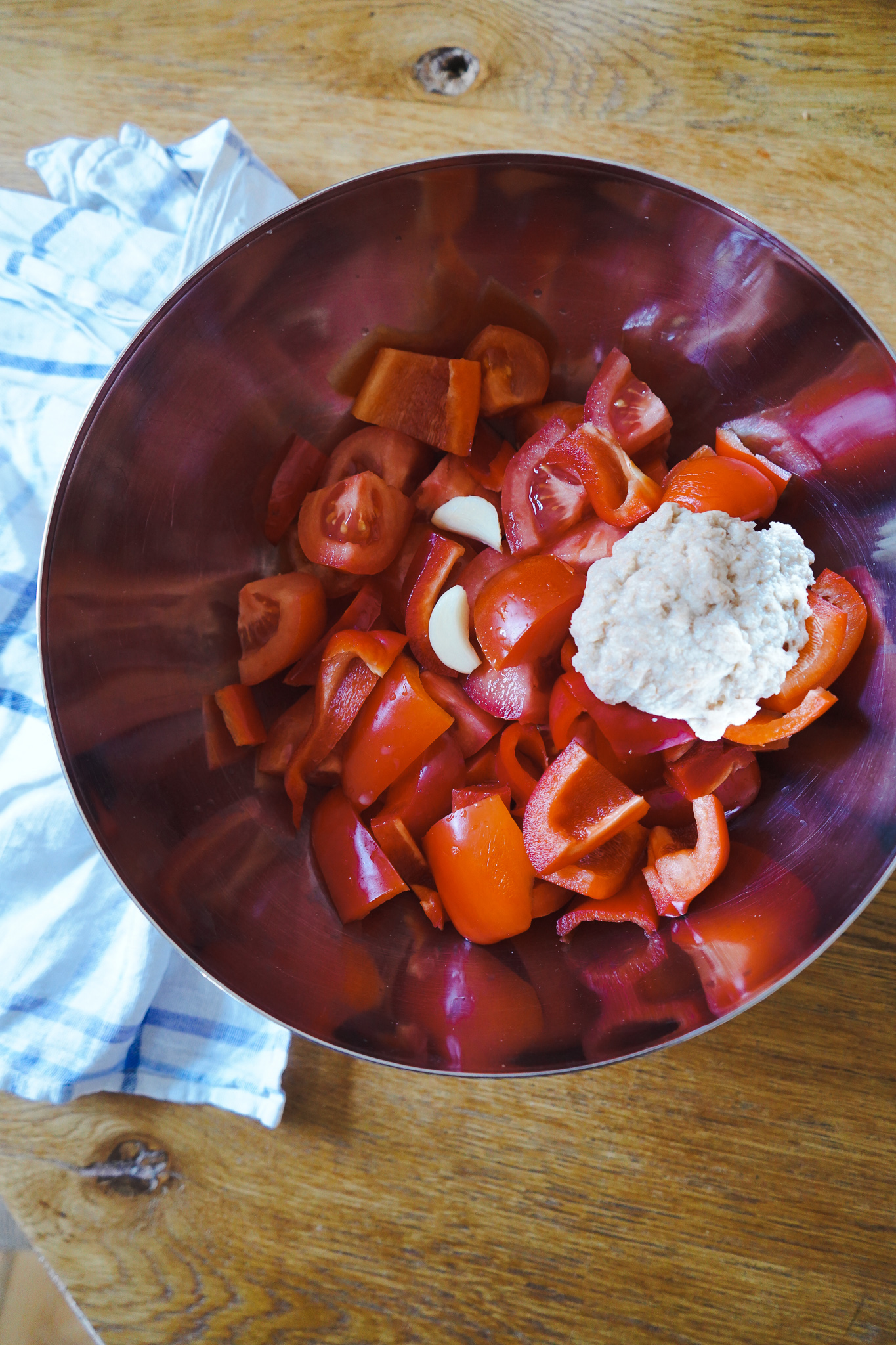 Die Rinde des Toastbrots abschneiden und beiseite stellen. Nicht wegschmeißen! Die Brotscheiben in Wasser einweichen. Tomaten waschen, den Strunk entfernen und in Viertel schneiden. Das muss nicht perfekt sein, ich häute die Tomaten noch nicht mal – die Solinger Klingen des Mixers bekommen wirklich alles klein. Rote Paprika waschen, entkernen und grob zerkleinern.