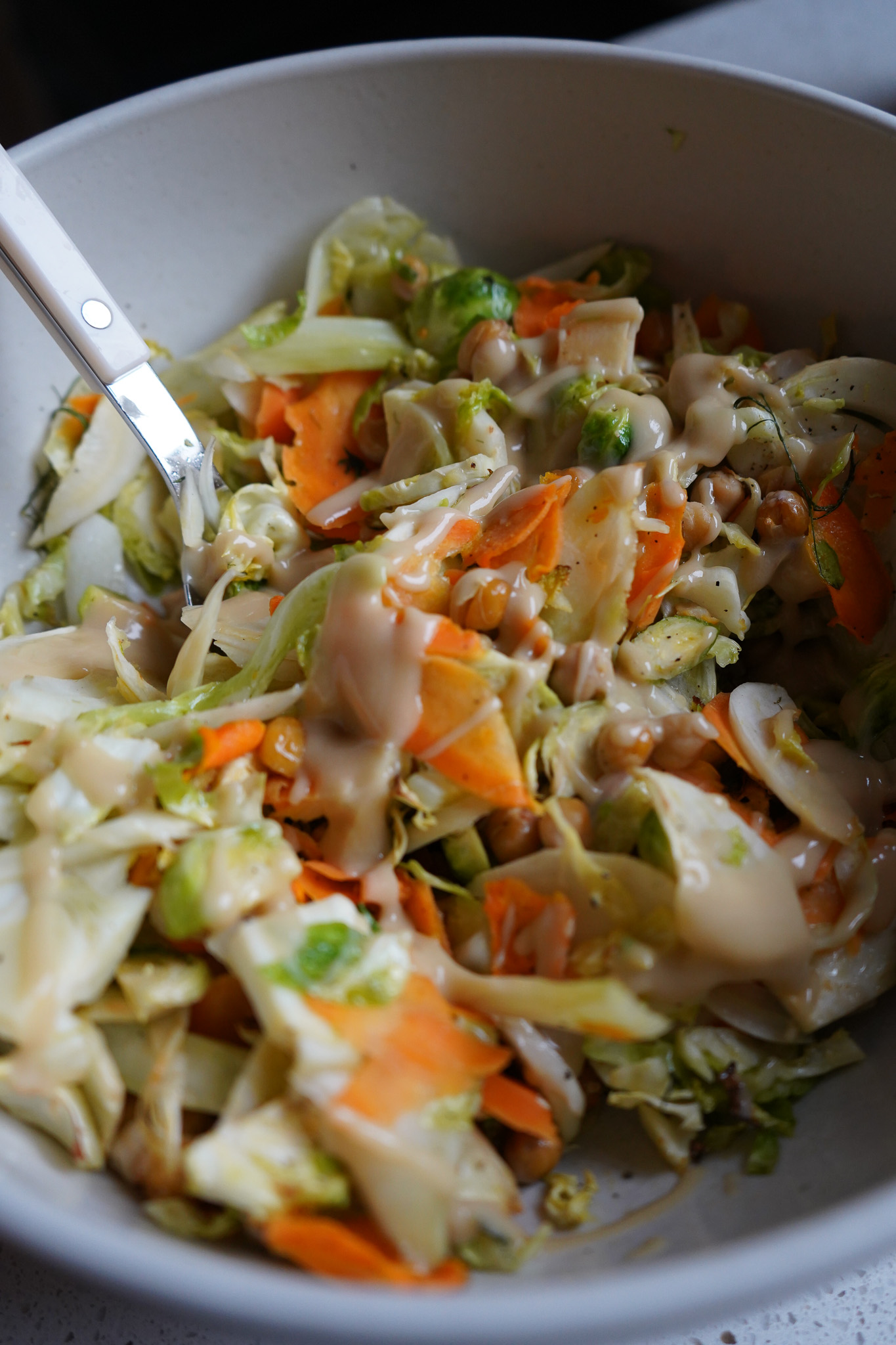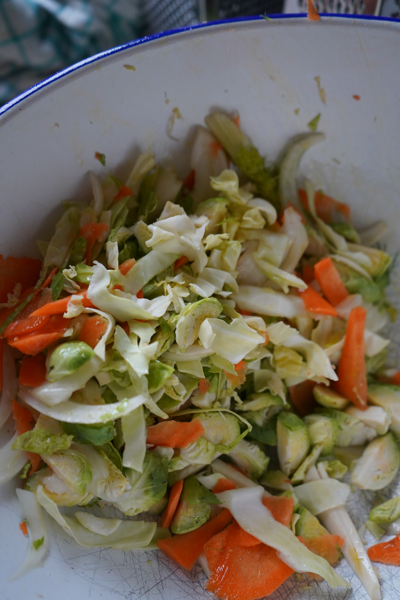 Bei der Zubereitung gibt nur einen Hack: Das Gemüse muss dünn geschnitten werden. Wir erinnern uns an den Fachbegriff: „Chiffonaden“. Bei Ofengemüse knallt man ja üblicherweise Chunks aufs Blech, bei einem Baked Salad sollte man das Gemüse wie Spitzkohl, Möhren oder Fenchel mit einer Microplane-Reibe oder einem scharfen Messer in dünne Scheibchen schneiden, damit sich nachher alles gut mit dem Dressing verbindet.