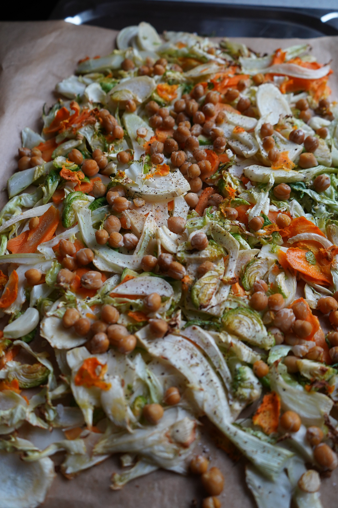 Ein Blech mit Backpapier auslegen, das Gemüse flach darauf ausbreiten. Kichererbsen darüber geben. Noch ein wenig salzen und gut pfeffern – wenn Kinder mitessen, weniger Pfeffer. Bei 130 Grad Heißluft für ca. 12 Minuten in den Ofen geben.