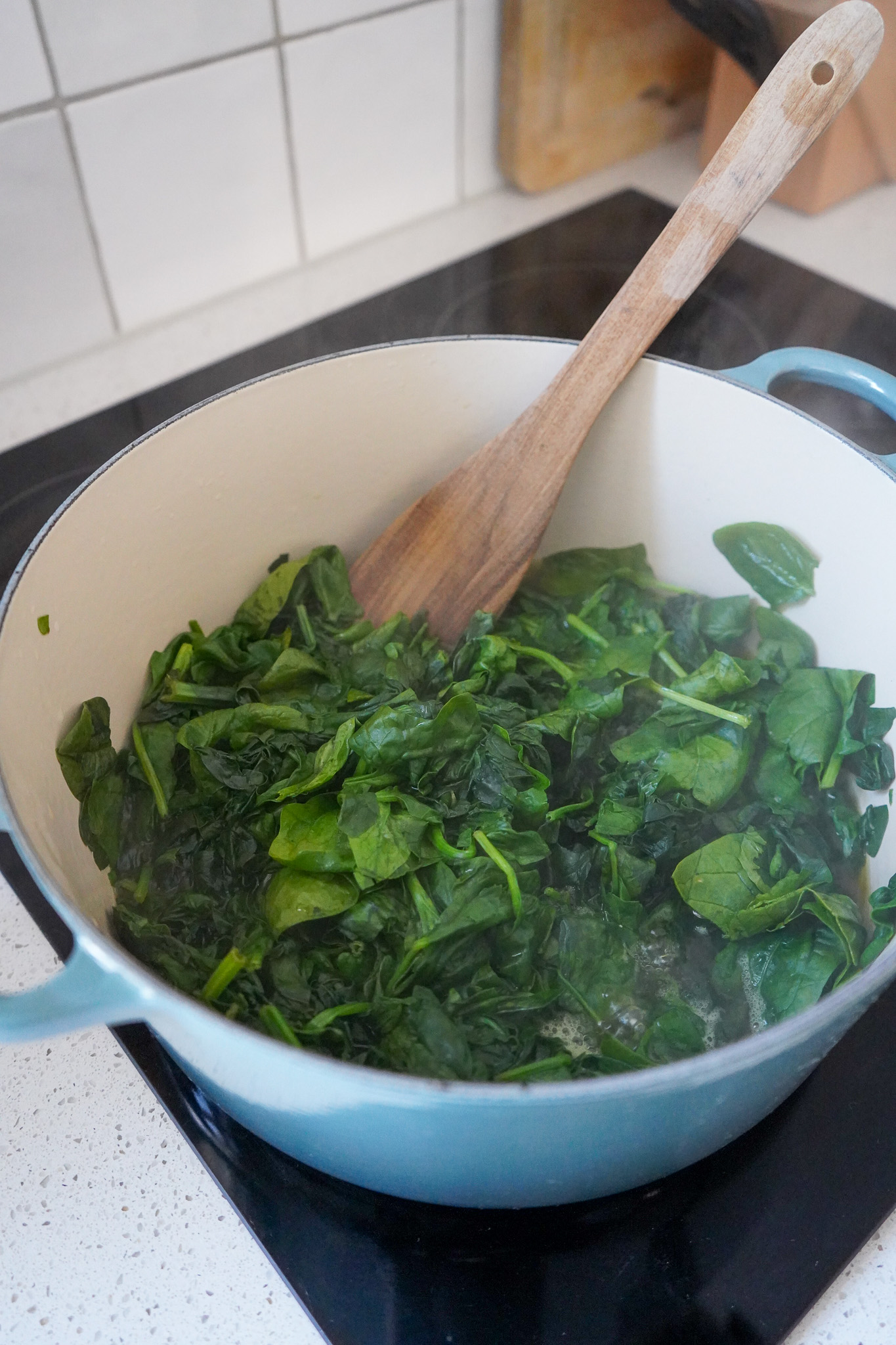 Spinat waschen und lesen. Große Stiele entfernen. Spinat in einem Sieb abtropfen lassen. Der Spinat muss nicht komplett trocken sein. Dann in einen großen Topf geben und bei mittlerer Hitze dämpfen, bis die Blätter zusammenfallen. Wieder in ein Sieb geben und die entstandene Flüssigkeit abtropfen lassen. Die Blätter mit einer Gabel vorsichtig auseinander teilen, damit alles gut ausdampfen und abtropfen kann. Der Spinat soll später auf dem Teller nicht schwimmen!