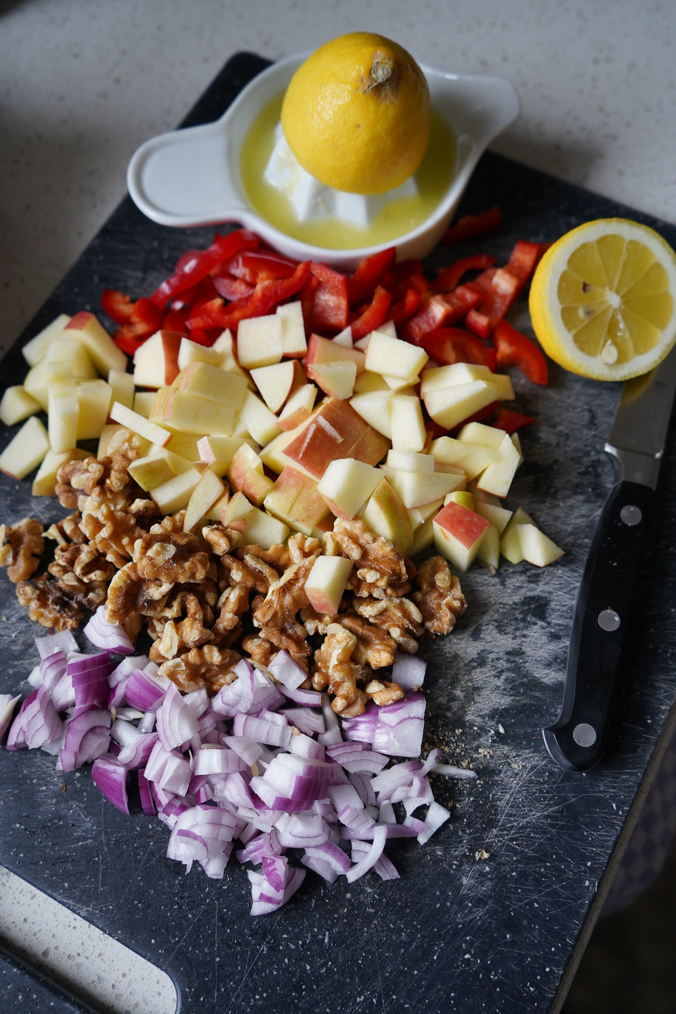 Grünkohl waschen, lesen und trocken schleudern. Ehrlicherweise wasche ich meinen Salat nie. Mit Salz, Zitronensaft und Olivenöl würzen und mit den Händen kneten. Tomaten, Zwiebeln, Paprika und Äpfel in kleine Stücke schneiden. Mit dem Grünkohl vermengen. Mit Salz, Pfeffer und ggf. etwas Balsam Apfelessig abschmecken. Feta und Walnüsse über den Salat zerkrümeln. Vorsichtig alle Zutaten vermengen und servieren. Wenn ihr mehr Süße braucht, könnt ihr noch Cranberries hinzufügen.