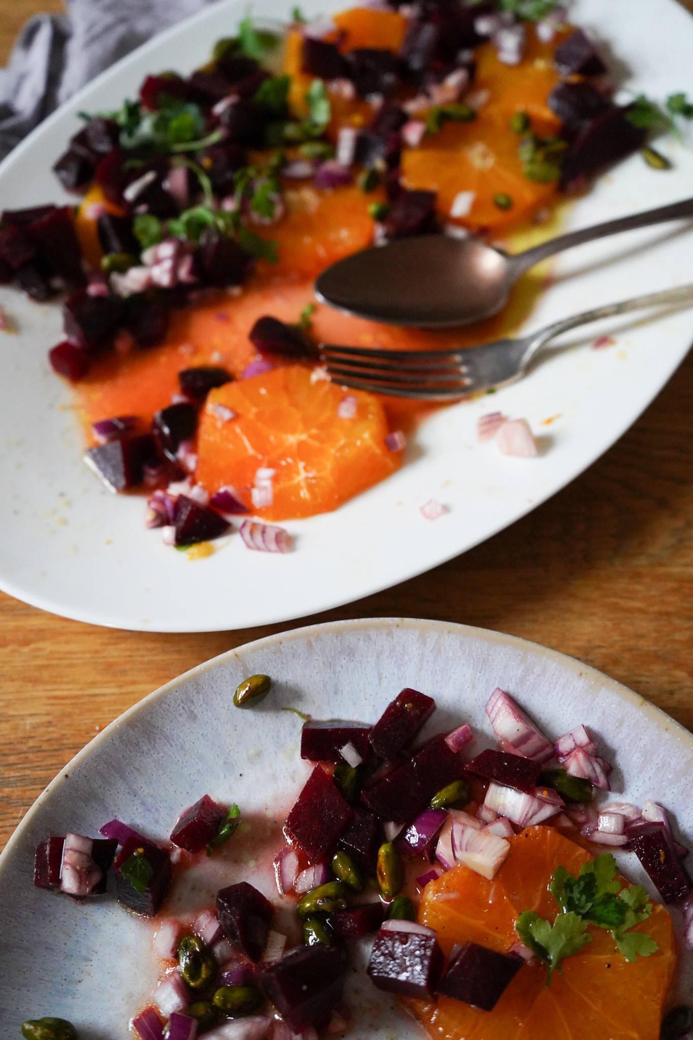 Schöner Salat mit Orangen, Roter Bete und Pistazien