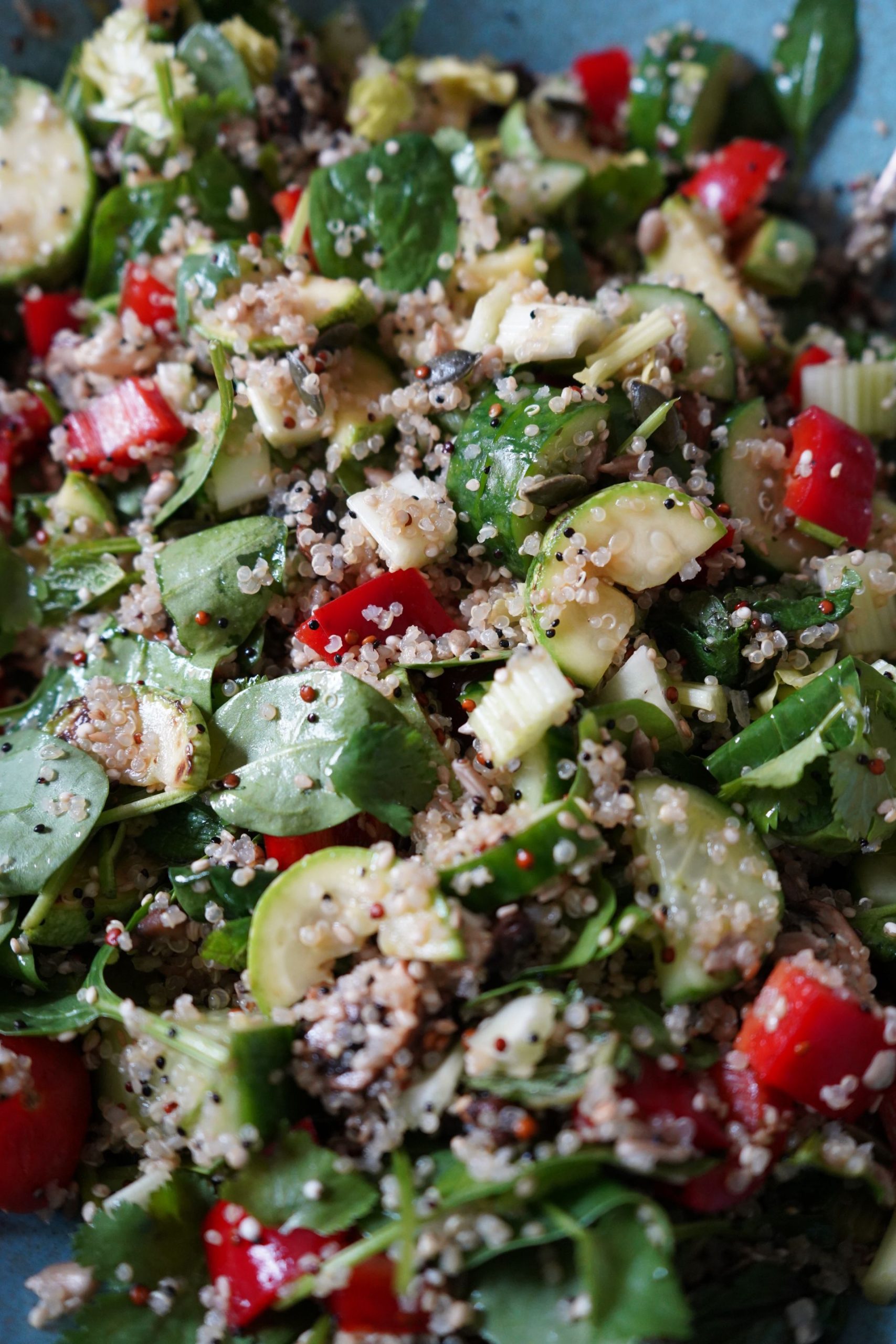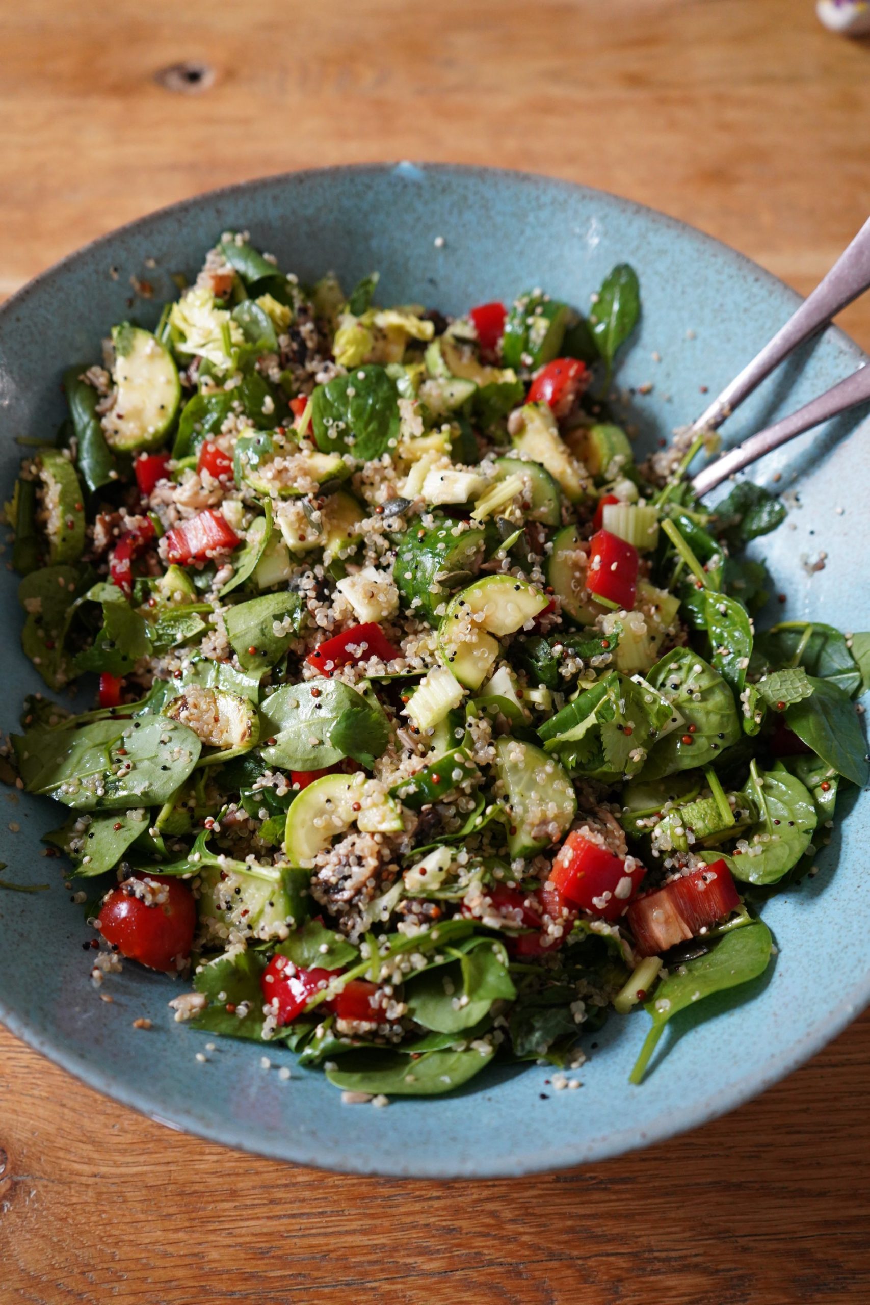 In einer kleinen Schüssel 3 EL Weißweinessig, 3 EL Olivenöl, 1-2 EL Reis- oder Agavensirup, 1 EL Zitronensaft mit 1-2 TL Meersalz und Pfeffer vermengen. Abschmecken. Sellerie, Pilze, Zucchini, Gurke, Tomate, Paprika und Kerne in eine Schüssel geben. Blattspinat und Kräuter dazu geben. Quinoa dazu und vorsichtig vermengen, sonst zermatschen die Blätter. Noch mal abschmecken und sofort servieren.