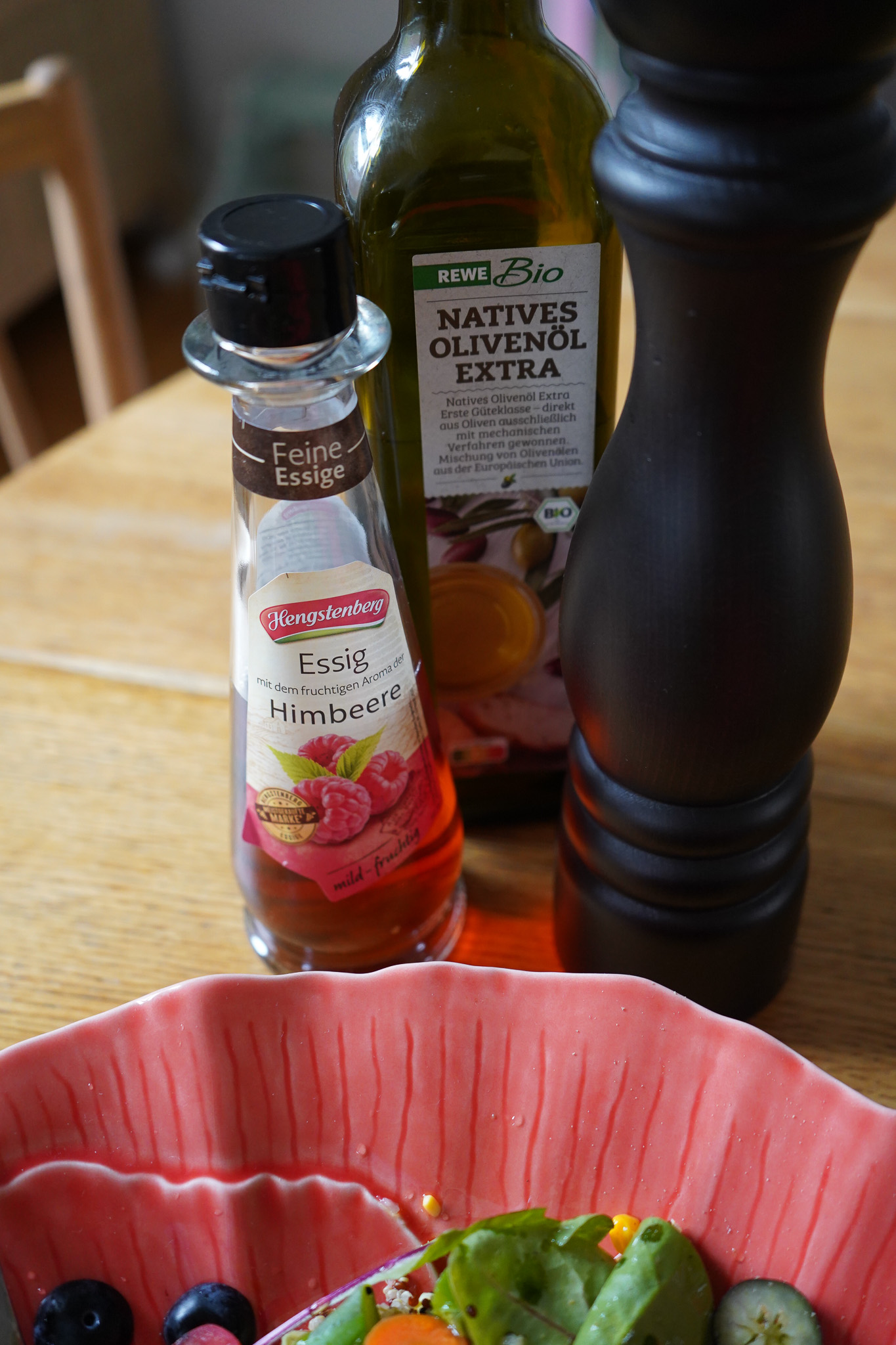 Das Dressing kommt aufgrund der vielen Zutaten eher minimalistisch daher: Meersalz, Balsam Apfel- oder Himbeeressig, Olivenöl, Pfeffer. Über die Blaubeeren im Salat kann man sich wundern, tatsächlich sehen sie quer geschnitten hübsch aus und ersetzen durch ihre Süße den Honig oder Sirup im Dressing. Seitdem ich den Ernährungskompass (* Affiliate-Link) von Bas Kast lese, bin ich mit Süßem noch zurückhaltender geworden. Auch bei Sushi-Lachs, aber das ist eine andere Story… Der Autor und Wissenschaftsjournalist trinkt seinen Espresso zum Beispiel nicht mit einem Teelöffel Zucker, sondern einem Stück dunkler Schokolade, weil darin weniger Zucker und mehr Pflanzenstoffe (Flavonoide) mit gesundheitsfördernder Wirkung enthalten sind. Fand ich spannend.