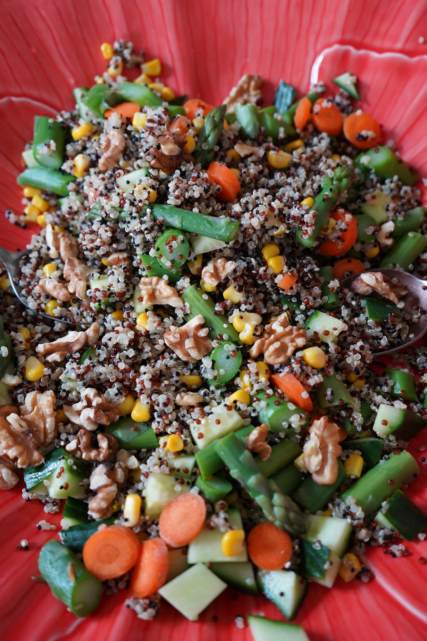 Den grünen Spargel schäle ich nicht, noch nicht mal die Möhren, weil ich einfach diese jungen Snackmöhren kaufe. Den Quinoa kann man schon am Vortag kochen. Dann ist dieser Salat schnell gemacht und sieht nicht nur dekorativ aus, sondern macht auch satt. Wer möchte, kann dazu Feta oder Mozzarella schneiden, ein Stück frisches Brot, Fisch oder Fleisch passen auch. Ich esse seit Karneval kein Fleisch mehr, daher bleibe ich bei der Veggie-Nummer.