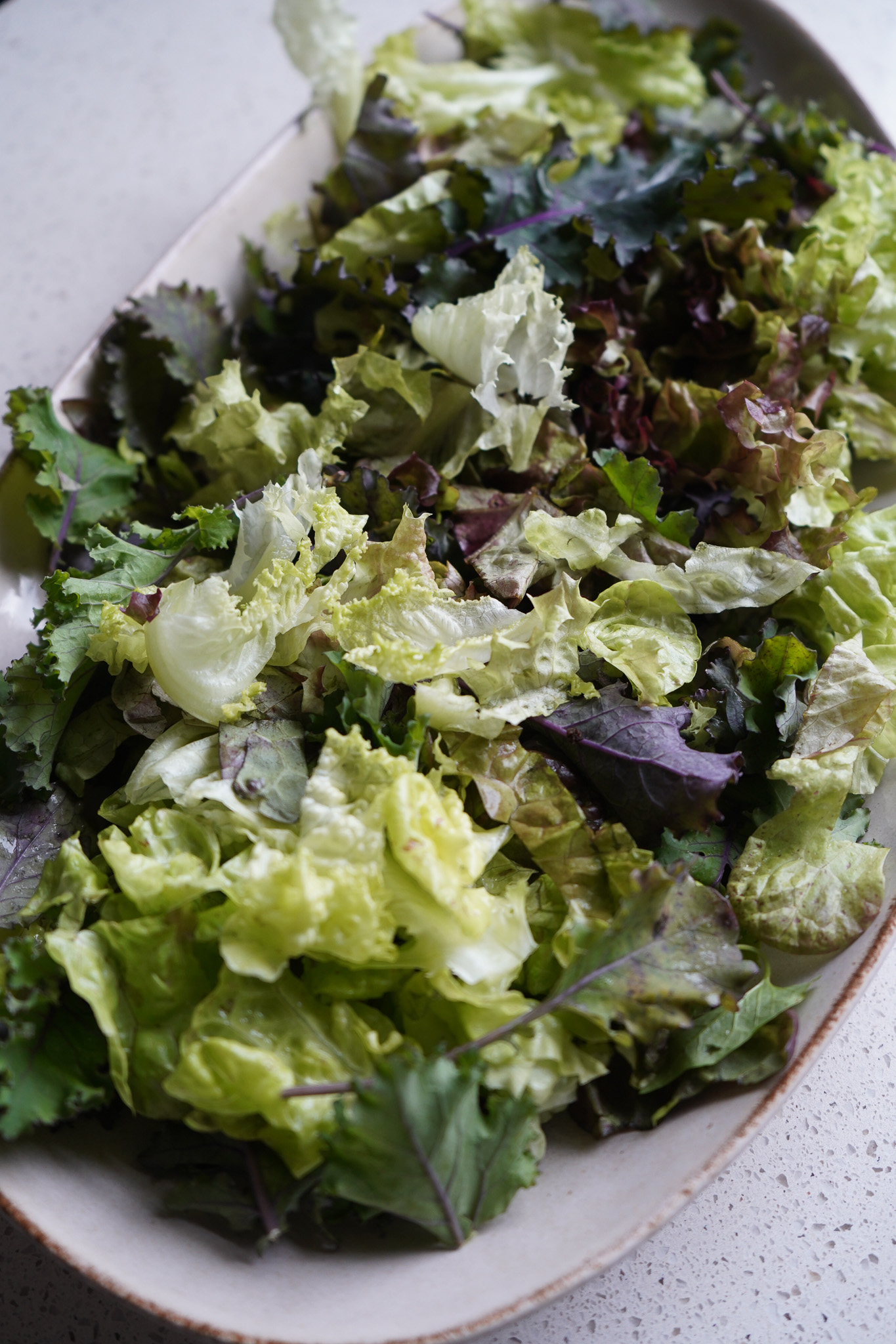 • Blattsalat-Mischung mit dunklen Blättern, z.B. Eichblattsalat, Rucola, Kale, Blattspinat…