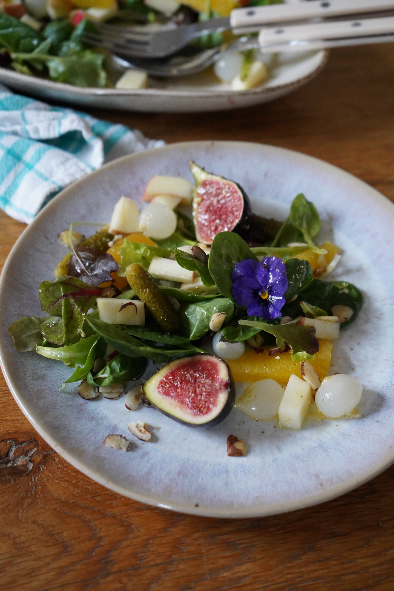 Blattsalate auf einem großen flachen Teller anrichten. Ich würde für diesen Salat keine Schüssel wählen, weil die Zutaten schwer sind und alle nach unten fallen. Das wäre schade. Äpfel, Feigen, Zwiebeln, Gürkchen und Haselnüsse also auf den Blättern verteilen. Es ist egal, wie, Hauptsache es sieht geil aus. Die essbaren Blüten kommen zum Schluss, sonst zermatschen sie.