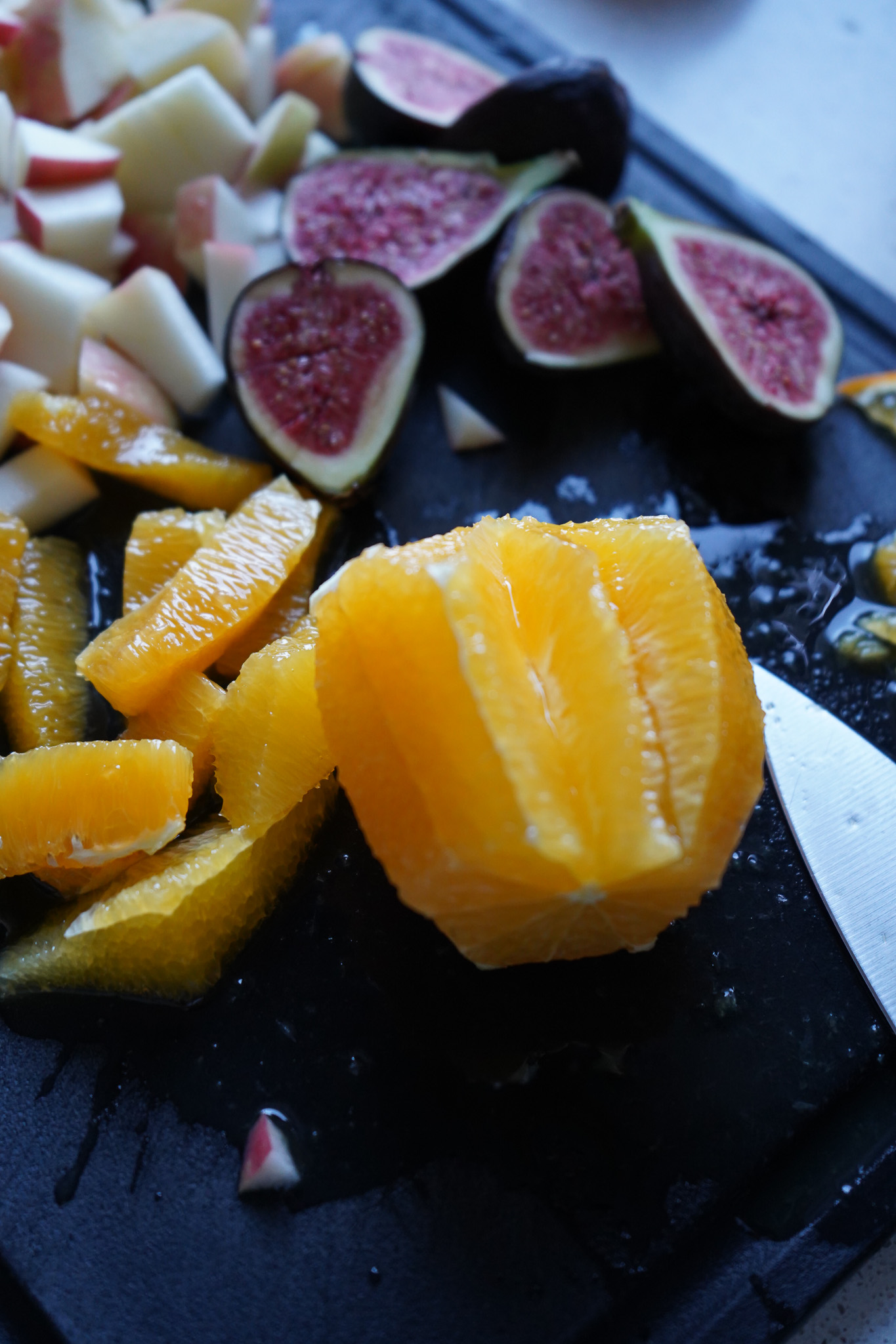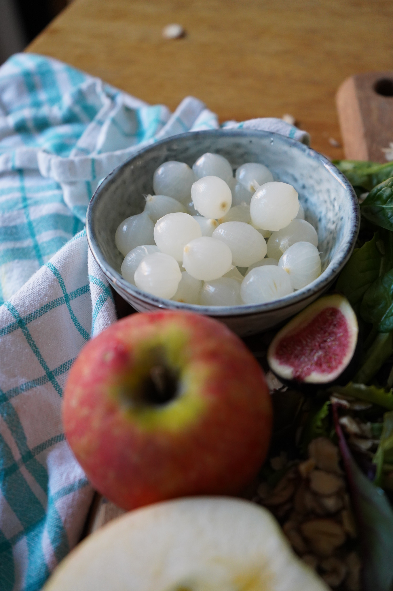 Für das Mise en place die Blattsalate waschen und lesen. Äpfel und Feigen waschen. Äpfel in kleine Würfel schneiden. Feigen halbieren. Perlzwiebeln und Gürkchen abgießen und abtropfen lassen. Orangen mit einem scharfen Messer schälen und die Filets aus der weißen Haut schneiden. Den Saft, wenn möglich, auffangen – ich empfehle deshalb ein Schneidebrett mit Saftrille. Wer kein Food Waste mag, kann die Reste der Orange essen, ich mache das auch. Die weiße Haut ist genauso gesund wie das Fruchtfleisch, aber im Salat will ich sie trotzdem nicht.