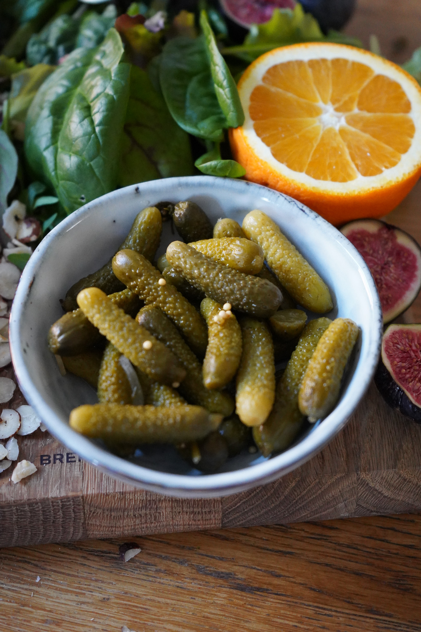 Heiligabend habe ich für meine Familie einen ähnlichen Salat gemacht und alle waren begeistert, deshalb ist das ab sofort ein neuer Standard. Ich mag an diesem schönen Salat, dass darin das Beste der kalten Jahreszeit zusammen auf den Teller kommt: Zitrusfrüchte, dunkle Blattsalate, Feigen, Nüsse und Äpfel. Und eben zwei Zutaten, die beim Fondue oder Raclette immer dabei sein müssen, aber seit 50 Jahren in der gleichen Art serviert werden, nämlich nackig und einsam als Beilage: kleine Zwiebeln und saure Gurken.