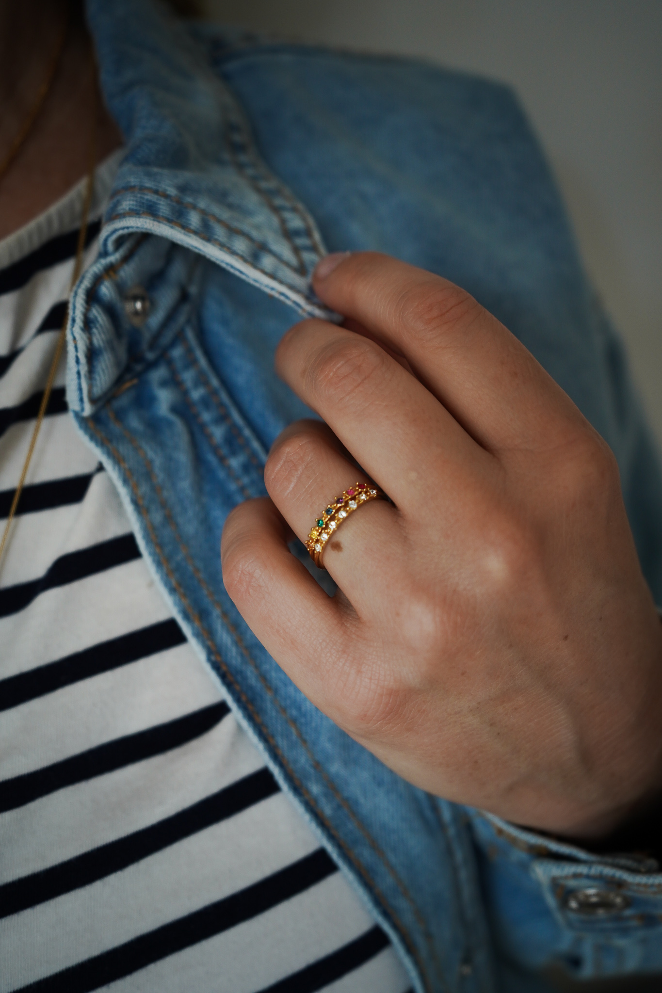 Dieser bunte Ring passt zu meiner fröhlichen Stimmung! Außerdem denke ich dabei immer an mein Lieblingssprichwort:“No Rain, No Rainbow“. Neu bei Stilnest sind die einfarbigen Ringe. Am besten man trägt gleich zwei oder drei davon übereinander (engl. „stacking“) und tauscht die Reihenfolge immer mal wieder aus.