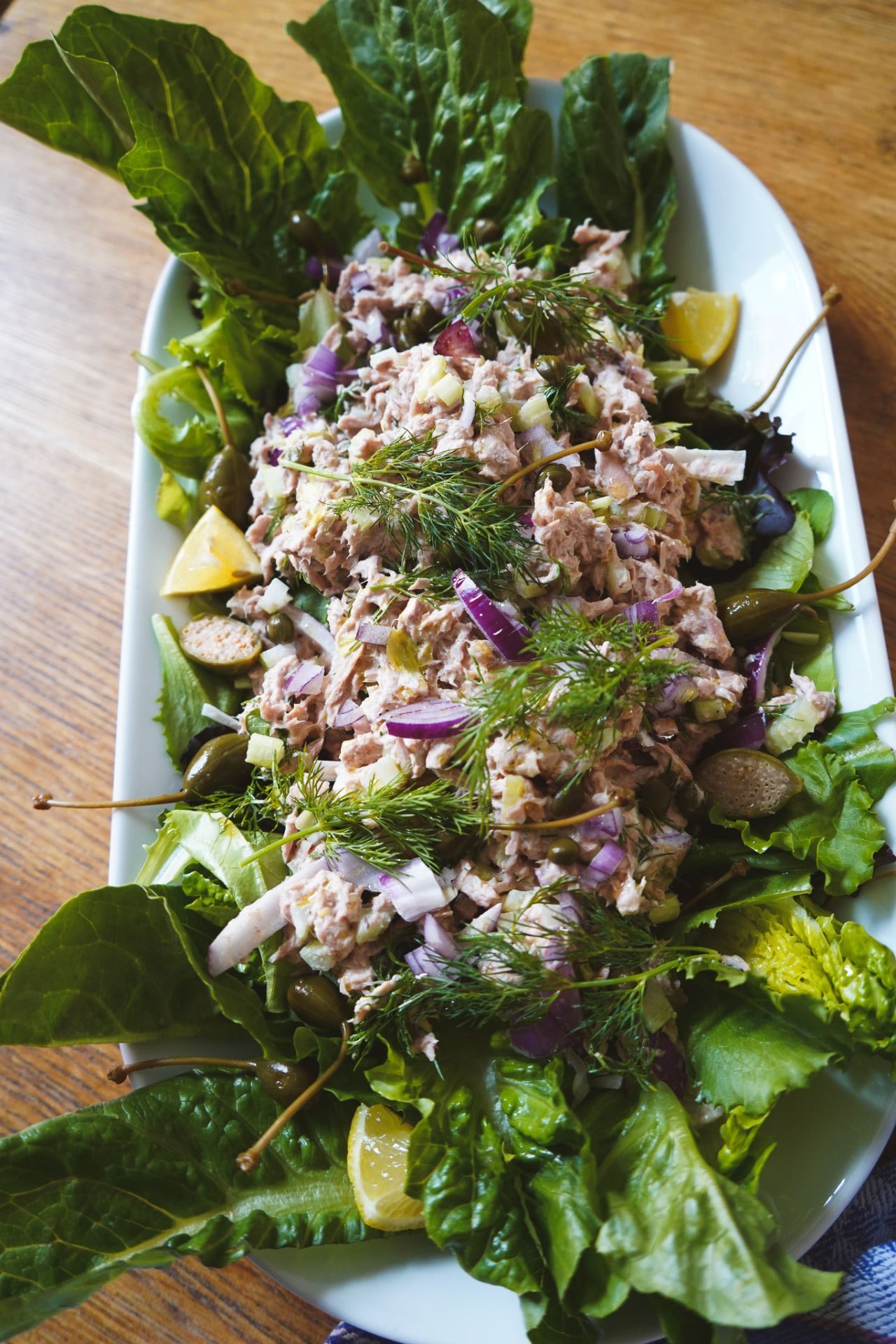 Blattsalate auf einer Platte arrangieren. Thunfischsalat portionsweise darauf geben. Mit Kapernäpfeln, Kapern, Zitronenspalten und dem restlichen Dill garnieren. Dazu passt geröstetes Brot.