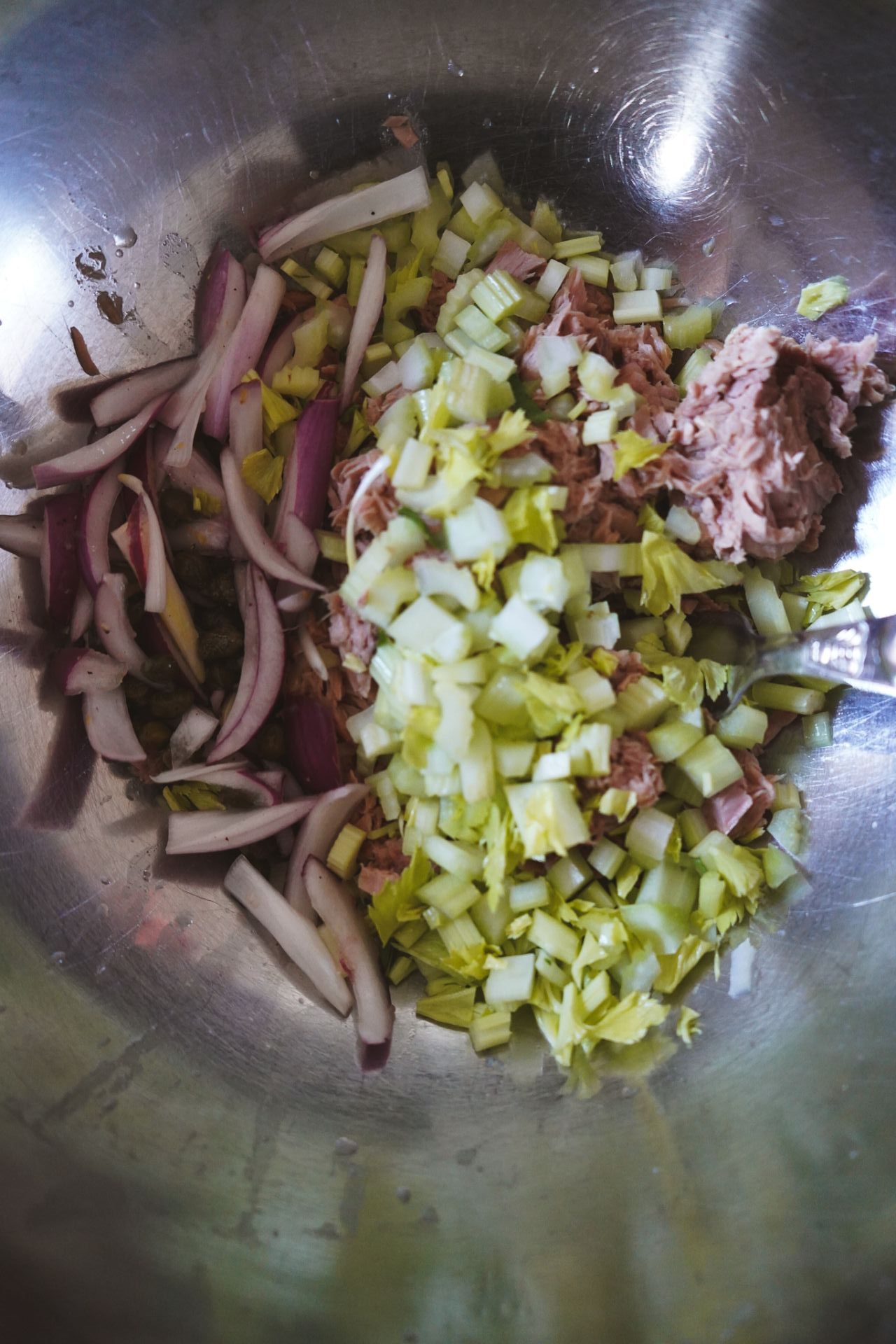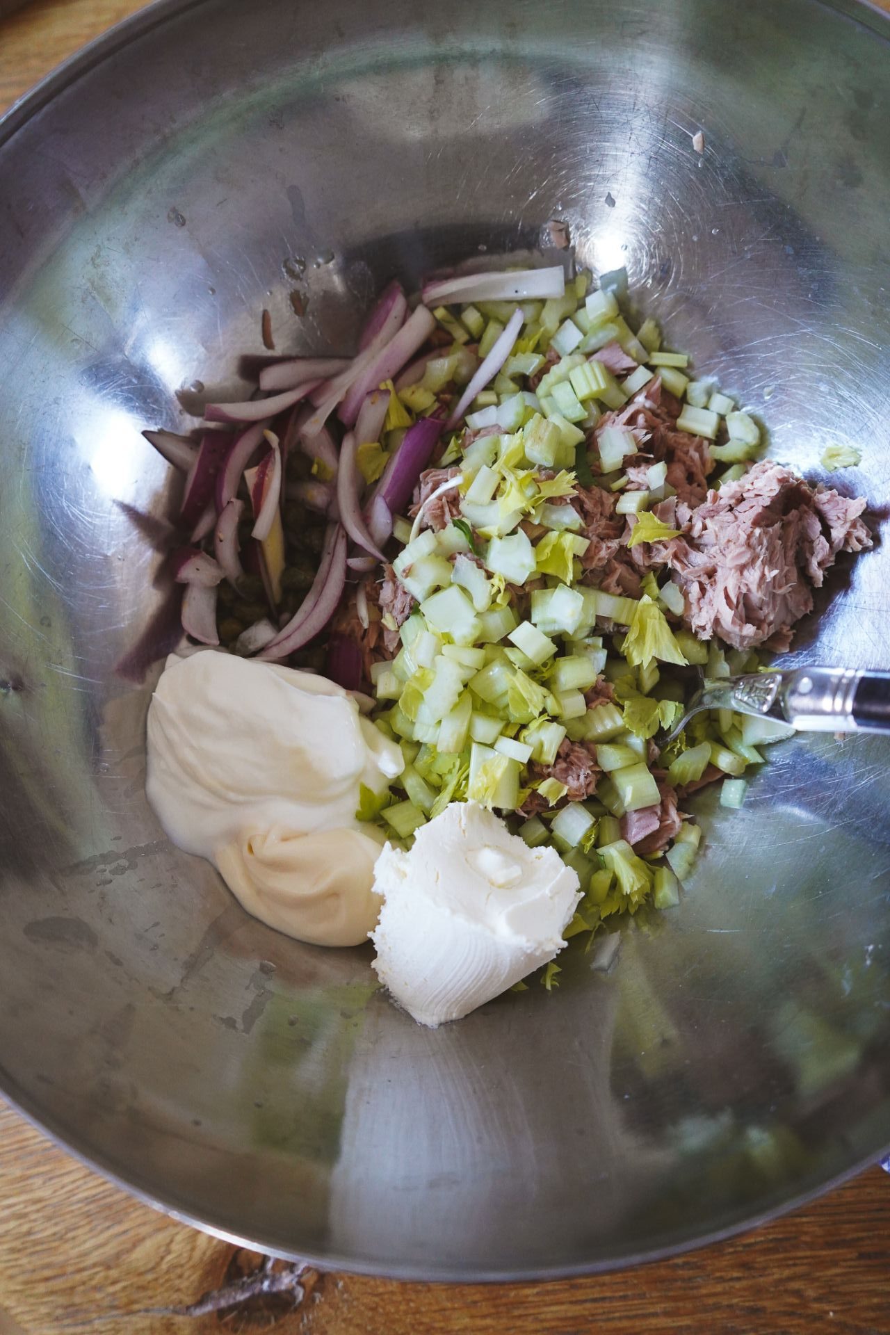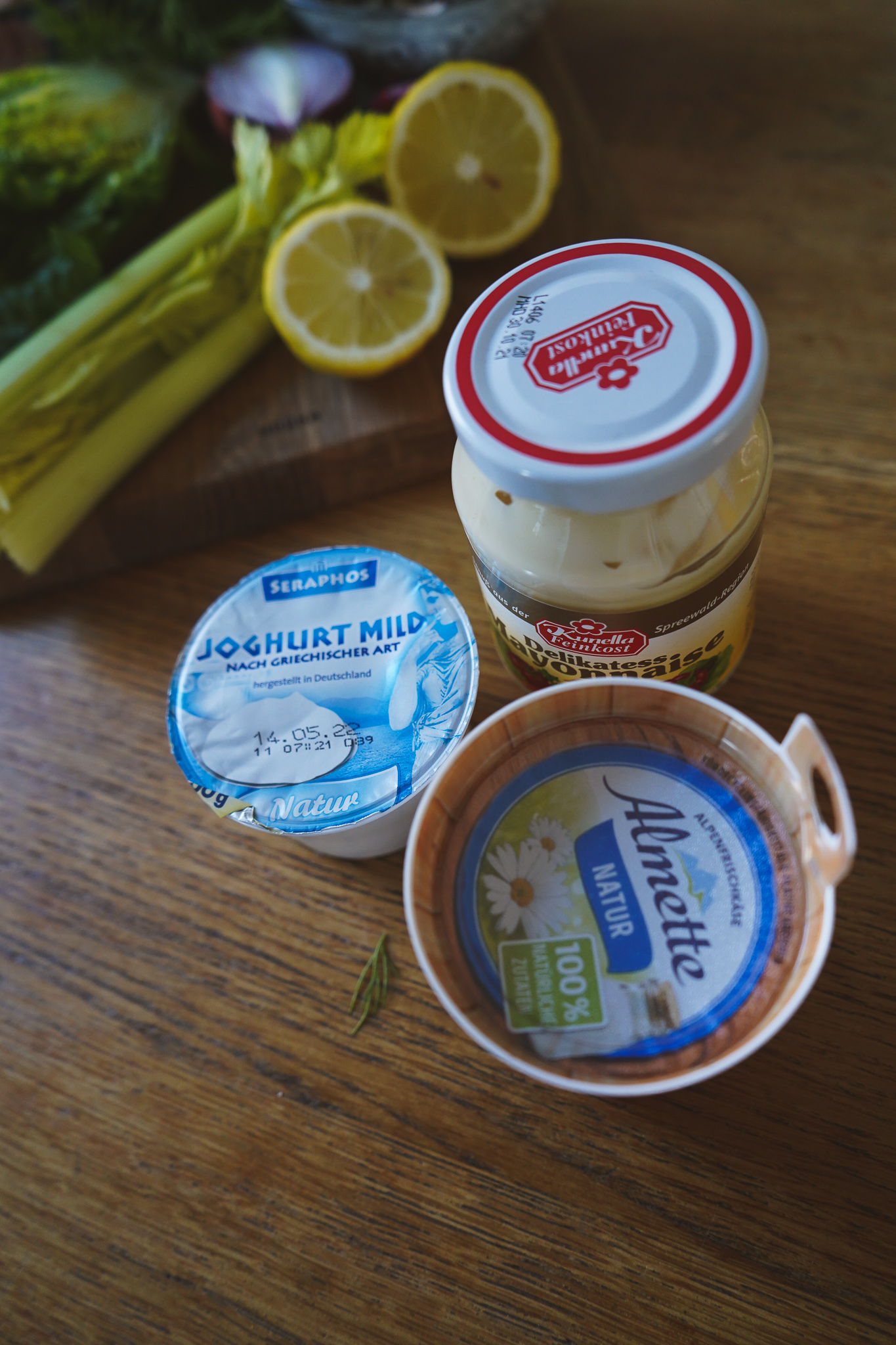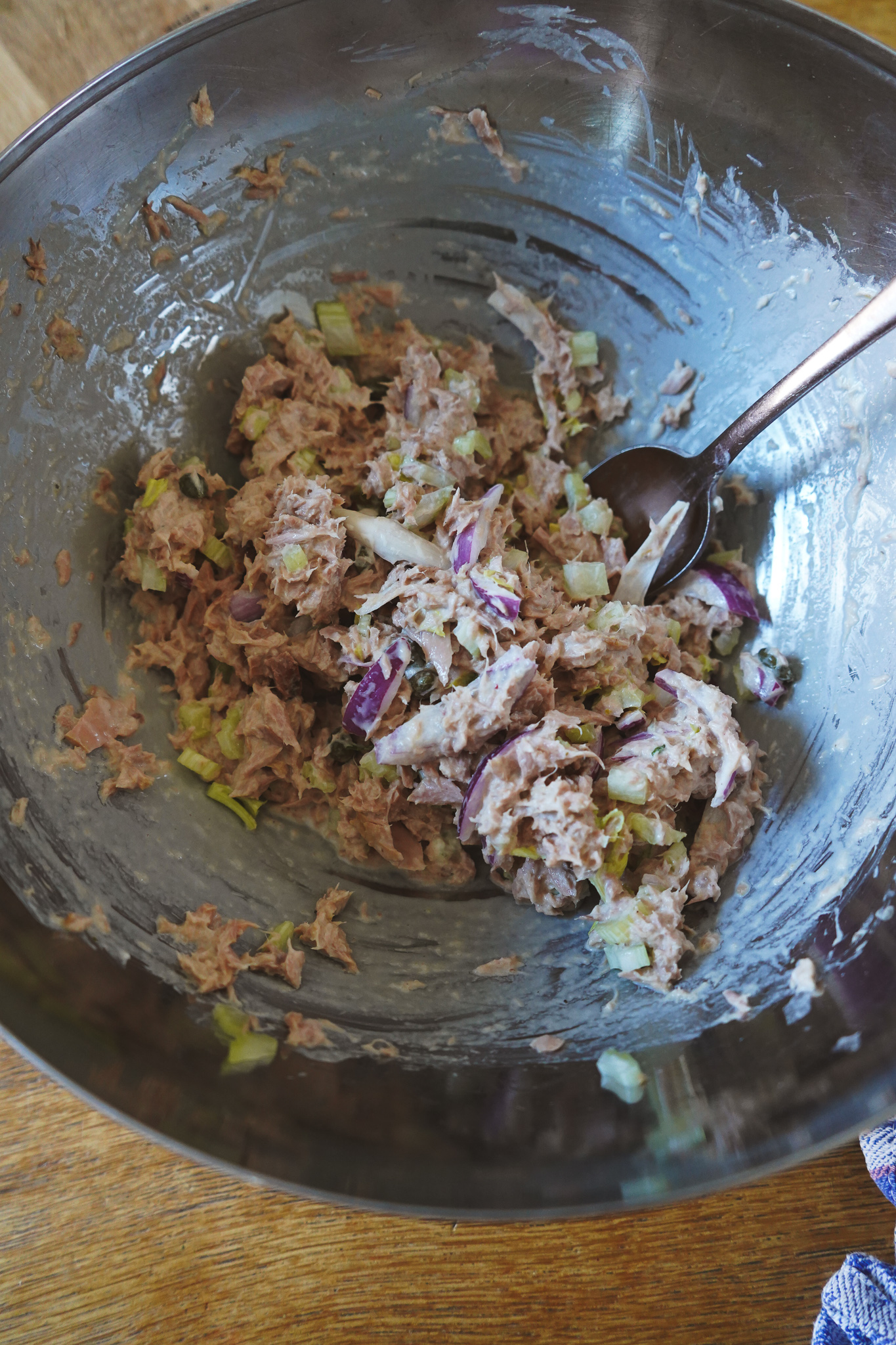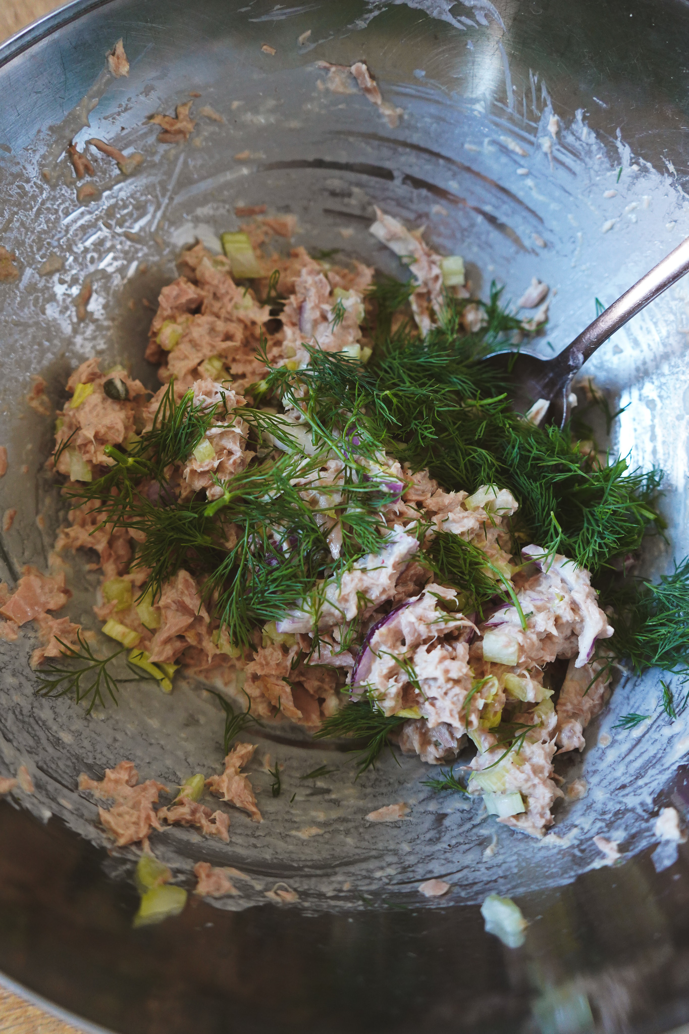 Thunfisch mit Zwiebel-Kapern-Mischung, Sellerie und jeweils 1 EL Mayonnaise, Frischkäse und Joghurt mischen. Salzen und pfeffern. Dill grob hacken und vorsichtig untermengen. Ein letztes Mal mit Salz, Pfeffer und Zitrone abschmecken. Falls ihr mehr Mayonnaise, Frischkäse und Joghurt mögt, dann gerne hinzufügen! Der Salat sollte leicht und cremig sein, nicht pappig.