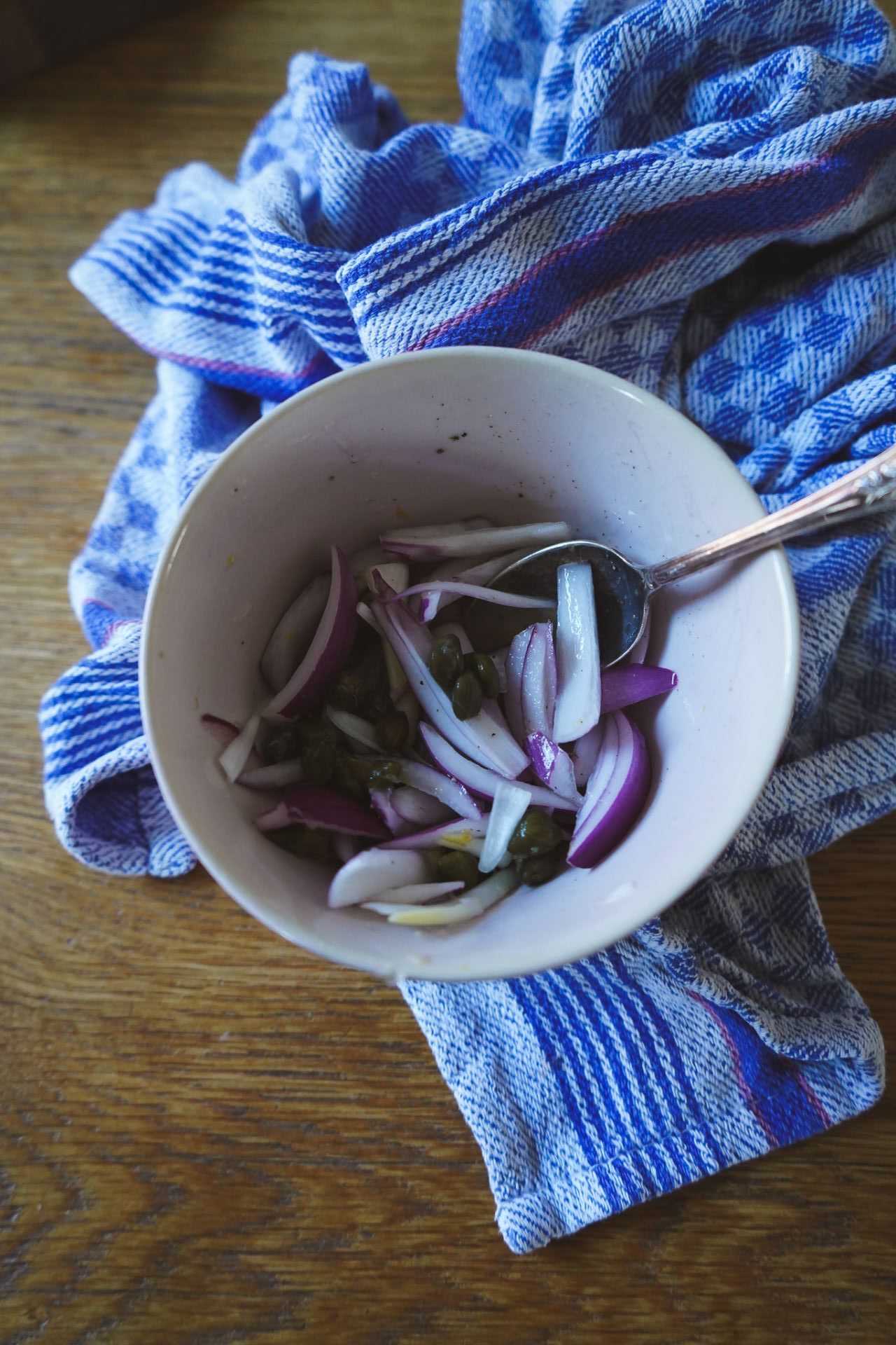 Thunfischsaft abtropfen lassen. Rote Zwiebel häuten, halbieren und in sehr feine Streifen schneiden. Saft der Zitrone auspressen. Schale abreiben. Zwiebel in Zitronensaft, -schale, kleinen Kapern und einer Prise Salz marinieren. So werden sie weicher und süßer.