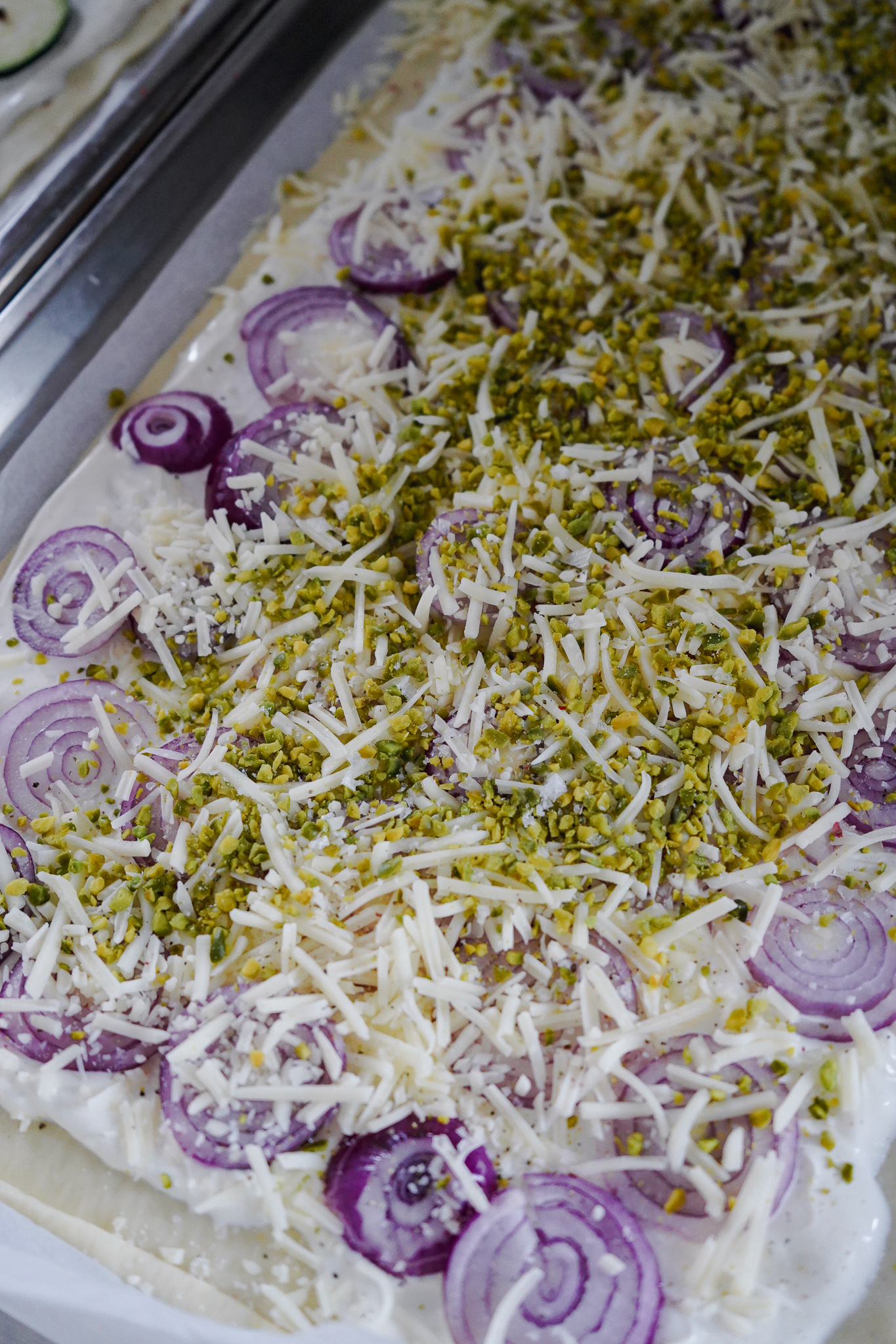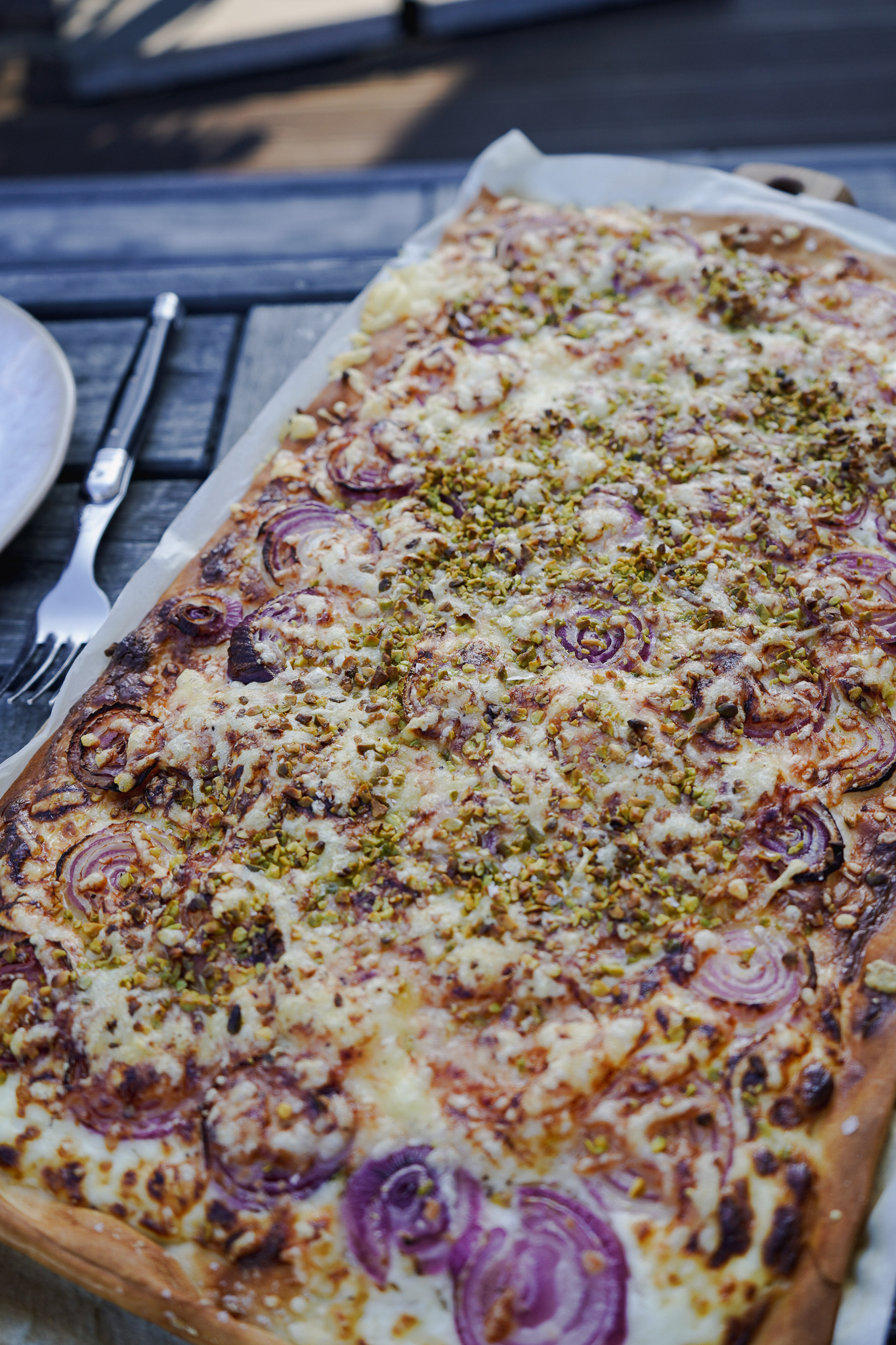 1. Flammkuchen mit roten Zwiebeln und Pistazien