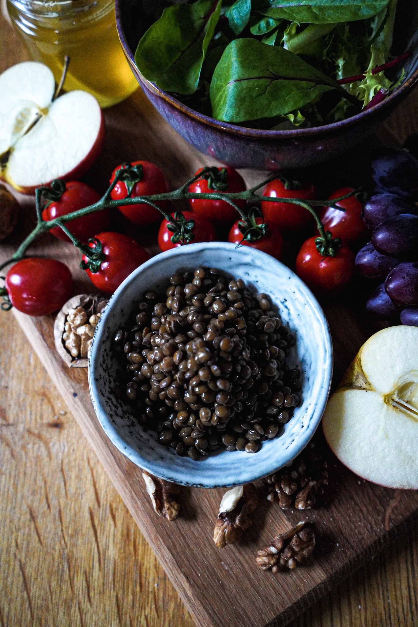 Salat und Obst waschen und putzen. Äpfel halbieren, entkernen, vierteln und in kleine Stücke schneiden. Trauben waschen und längst halbieren. Tomaten waschen und quer halbieren. Das sieht hübscher aus, sagt Flori und ich gebe ihm recht. Die Linsen abspülen und gut abtropfen lassen. Die Salatblätter in einer Schüssel, meine ist von Lonja Living, anrichten. Eine Handvoll Linsen vorsichtig darüber streuen. Den Salat mit den klein geschnittenen Äpfeln, Trauben und Tomaten garnieren. Für das Dressing die oben genannten Zutaten vermischen und abschmecken. Ich mache mein Dressing gerne in einem ausgewaschenem Marmeladen- oder Pastasaucen-Glas, damit sich Senf und Essig besser miteinander verbinden. Laut Rezept kann man auch Schnittlauch hinzufügen. Den gab’s bei uns nicht, also habe ich ihn weggelassen.