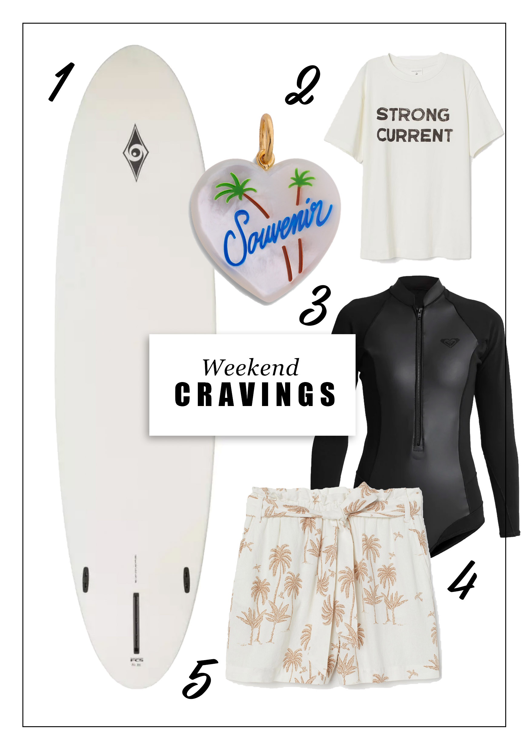 1. SUP-Hardboard: Decathlon, SUP-Paddel: Decathlon, 2. T-Shirt: H&M, 3. „Souvenir“-Kettenanhänger: Jane Koenig, 4. Badeanzug: Roxy, 5. Paperbag-Shorts: H&M